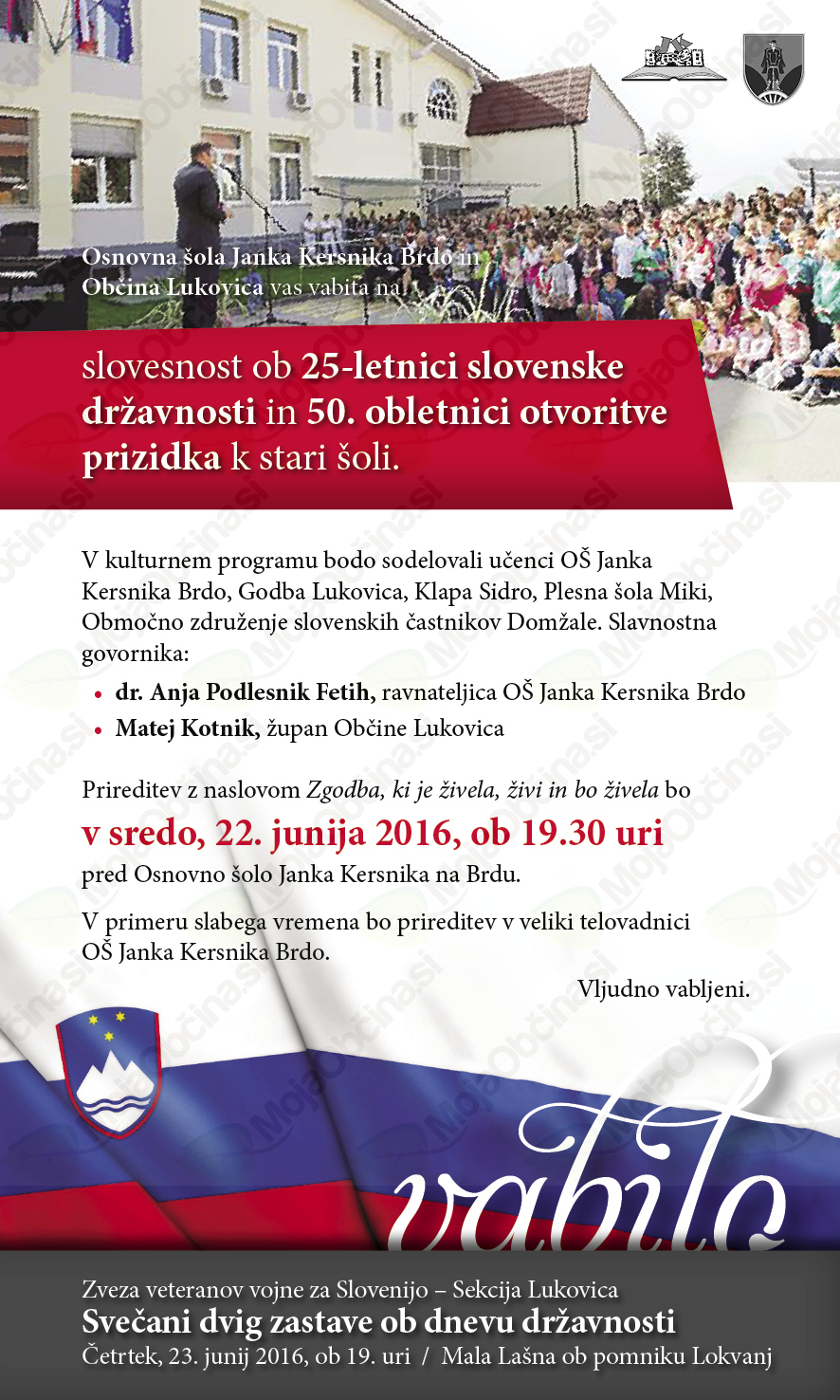Osnovna šola Janka Kersnika Brdo in Občina Lukovica vas vabita na slovesnost ob 25-letnici slovenske državnosti in 50. obletnici otvoritve prizidka k stari šoli.