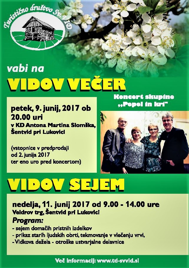 Tradicionalni, že 7. Vidov sejem bo letos v nedeljo, 11. junija 2017. Na njem boste tudi letos našli bogato ponudbo domačih ekoloških pridelkov in izdelkov: od sadja in zelenjave okoliških in bolj oddaljenih kmetij, mlečnih izdelkov, suhih mesnin, različnih olj, pekovskih izdelkov, testenin, slaščic, domačih čajev in zeliščnih izdelkov, predstavljajo pa so se tudi ponudniki keramičnih in glinenih izdelkov, steklenih in lesenih izdelkov, unikatnih oblačil, naravnih kozmetičnih preparatov ...Poseben čar Vidovemu sejmu dodajo mojstri domače obrti: obiskovalci lahko spoznajo rezbarstvo, kovaštvo, izdelavo košar in košev, kleklanje, filcanje, pletenje…Otroci pa bodo tudi letos ustvarjali in se zabavli v Vidkovi deželi.