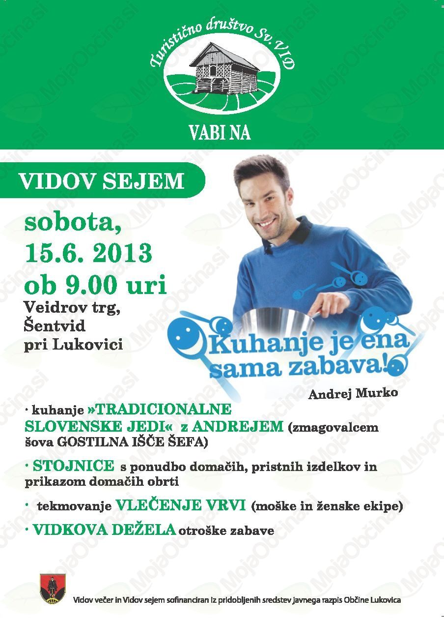 15.6. 2013 med 9.00 in 15.00 uro – Veidrov trg, Šentvid pri Lukovici; 3. VIDOV SEJEM - kuhanje "TRADICIONALNE SLOVENSKE JEDI" z Andrejem (zmagovalcem šova GOSTILNA IŠČE ŠEFA), številne stojnice, tekmovanje VLEČENJE VRVI ter VIDKOVA DEŽELA otroške zabave.