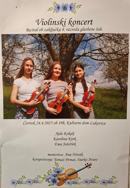 Ajda, Ema in Karolina bodo v četrtek 24. aprila v Kulturnem domu Janka Kersnika v Lukovici ob 19. uri pripravile zanimiv violinski recital ob zaključku 8. razreda glasbene šole.V preteklosti so nas že navdušile s svojim nastopom in ne dvomim, da tokrat ne bo tako. Zato vabljeni v četrtek 24. aprila na violinski koncert v Lukovico.