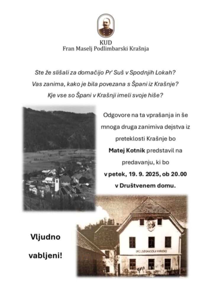 V petek 19. septembra ob 20. uri bo v Kulturnem domu v Krašnji imel predavanje o Španovi hiši, kasneje šoli Matej Kotnik. Kaj je počel tu cesar Jožef II, so v kleti bili res zakopani Francozi? Kaj ima ta hiša opraviti z našim jezikom in Avstrijskim državnim parlamentom na Dunaju? Kaj je resnica in kaj je plod ljudske domišljije? Še več o najpomembnejši krašenjski hiši, ki je žal ni več, pa na predavanju. Če vas zanima, ste lepo povabljeniv Društveni dom v Krašnjo.