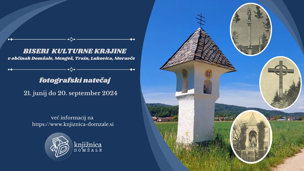 Knjižnica Domžale vas vabi, da tudi letos sodelujete pri fotografskem natečaju. Delite z nami fotografije biserov kulturne krajine v občinah Domžale, Mengeš, Trzin, Lukovica in Moravče. Na natečaju lahko sodelujejo vsi ljubitelji fotografije: ljubiteljski, naključni ali profesionalni fotografi. Natečaj traja od 21. junij - 20. septembra 2024.