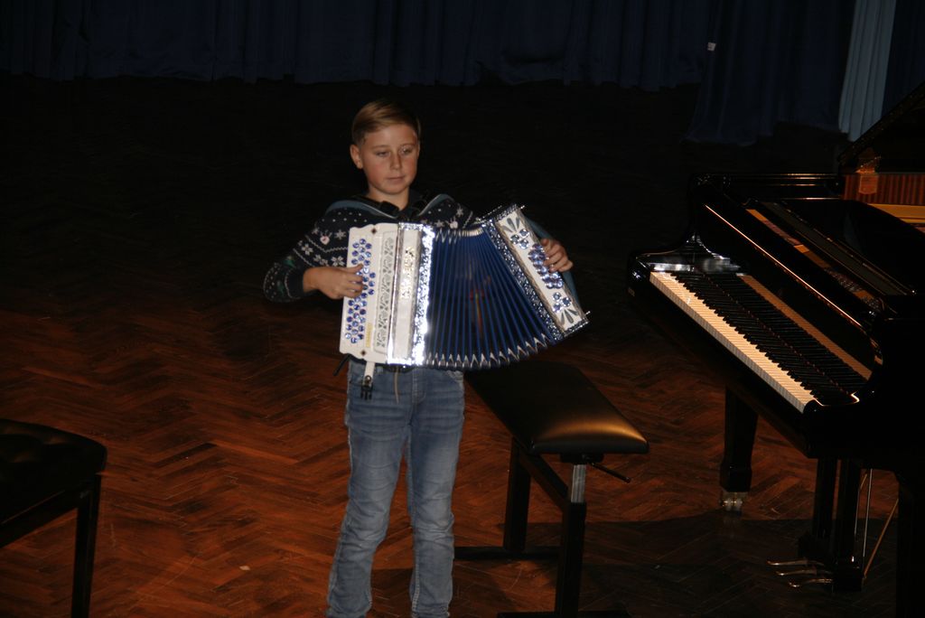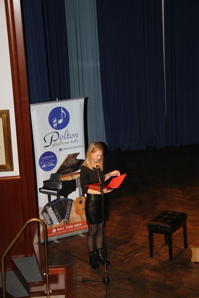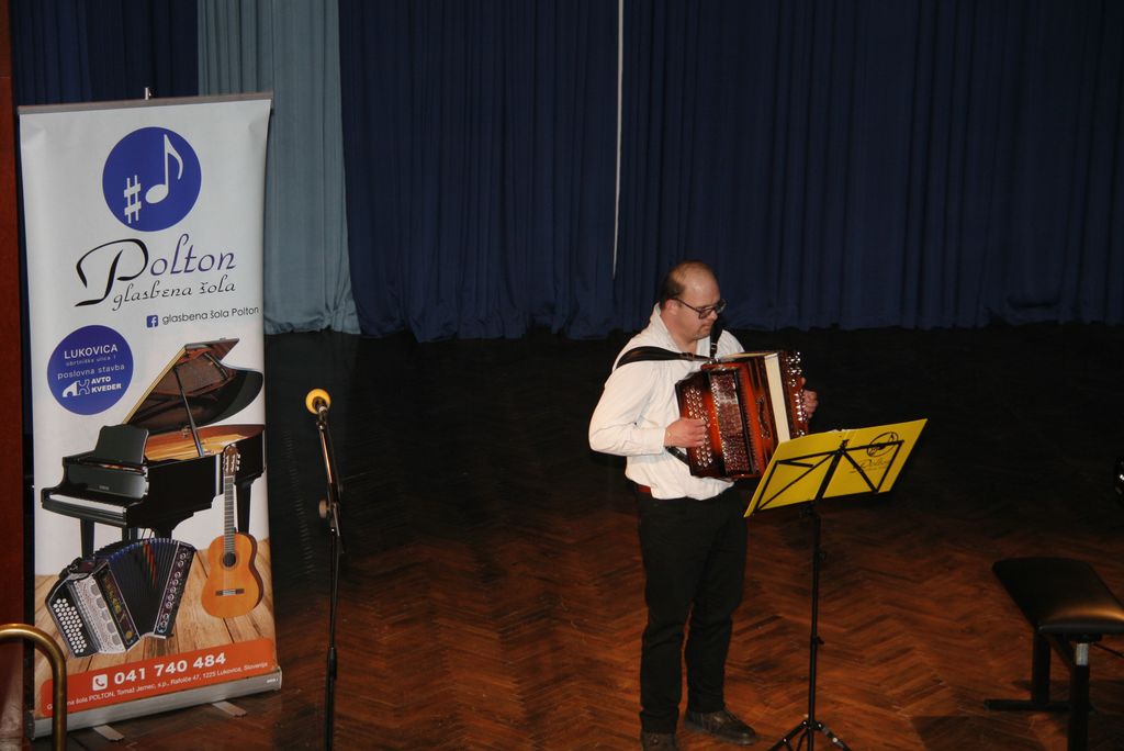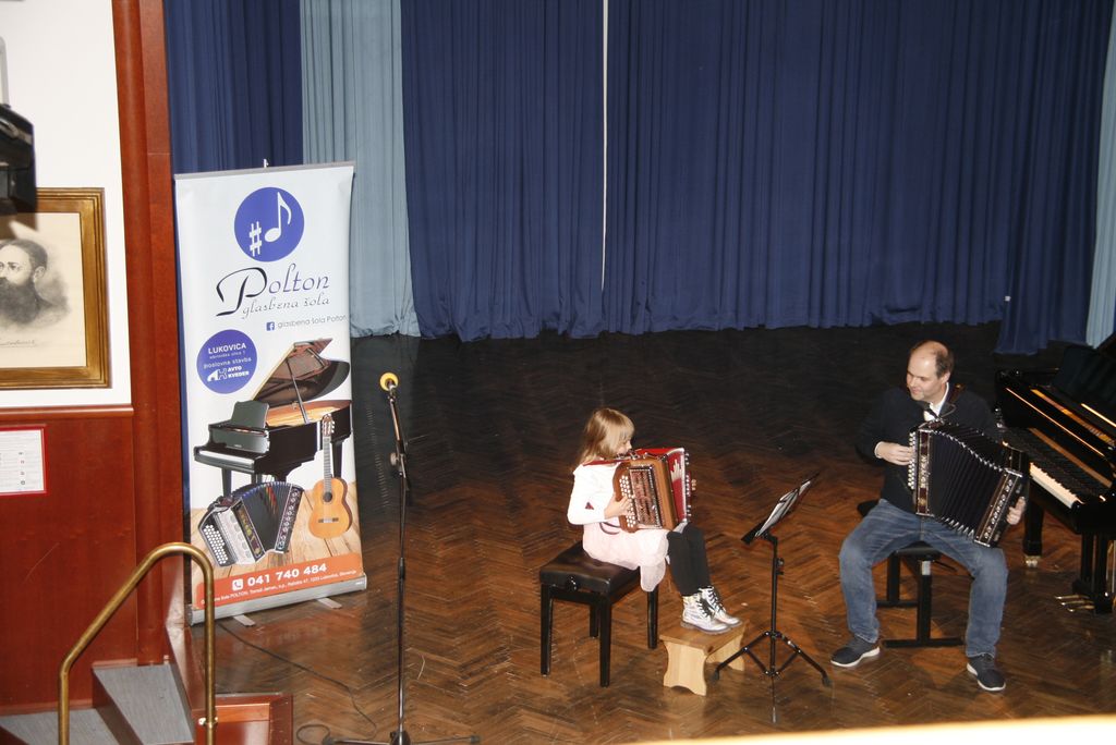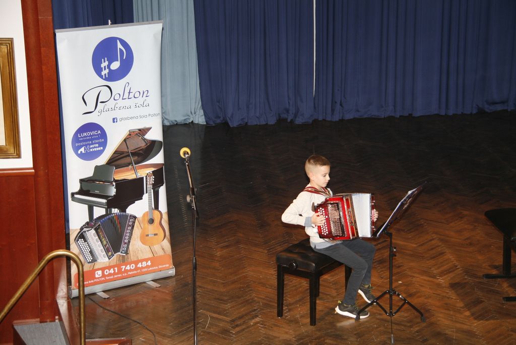 Na oder so počasi drug za drugim prihajali Loty, Jaka, Val in Tim  Žan, Tevž, Lara, Nej, Lovro, Grega, Manca, Tevž, Matija, Luka, Klemen, Katja, Miha, in še en Miha, Mark ter Valentin in Matic in nam zaigrali na harmoniko. Eni tiste osnovne kot na primer  Račka plavačka, drugi bolj zahtevne kot je Bele snežinke, a to je bil šele uvodni nastop učencev glasbene šole Polton.