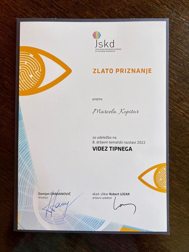 Na otvoritvi so zlata priznanja podelili vsem 55. izbranim avtorjem. Z velikim veseljem in zadovoljstvom smo sprejeli novico, da je bila med njimi tudi Marcela. Skupaj z njo se veselimo tudi vsi člani likovne sekcije in ji za ta dosežek še enkrat iskreno čestitamo in ji želimo še veliko ustvarjalnih užitkov.