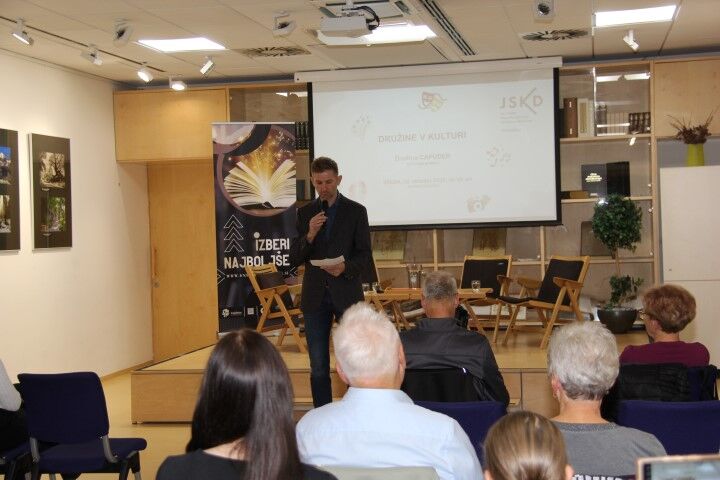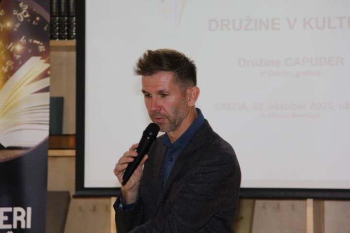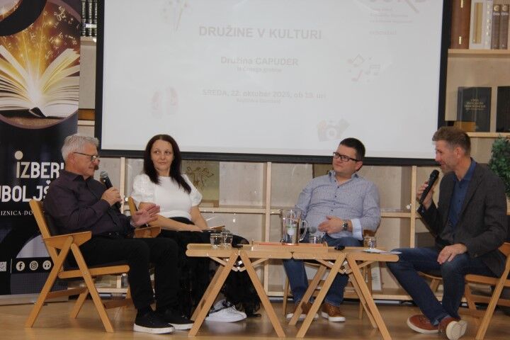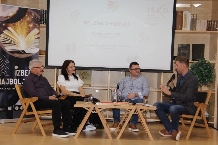 Tako smo v organizaciji JSKD OI Domžale in Knjižnice Domžale v sredo, 22. oktobra 2025, v sklopu programa »Družine v kulturi«, spoznali družino Capuder iz Črnega grabna. Led je tokrat prebila družina Capuder in ker so takole iz raznih koncev Črnega grabna so predstavljeni kot družina Capuder iz Črnega grabna. Kar dve generaciji sta tokrat pripovedovali o svojem delovanju na področju kulture. Ob pomoči Mateja Primožiča so nam Anton, Rok in Petra Capuder predstavili njihovo delovanje v kulturi. A ne le njihovo, tudi delovanje ostalih članov obeh družin. Začenši od starih staršev, preko stricev in tet do staršev in otrok ter vnukov in vnukinj, kakor je dejal Tone, se je pri njih vedno pelo, saj so imeli glasove lepo podeljene tako, da so se ujeli in še vedno se poje obvezno na srečanjih, ki jih imajo pri Šajčevih, od koder izhaja pokojni oče, ki je svoje sinove navdušil za petje. Ko se zberejo vsakih nekaj let, zbere se jih že kar 150, kar je dovolj za dober zbor. Kako potem ne bi peli v različnih zborih, ne le starši, tudi otroci, igrali pri godbi ali v priložnostni skupini, ki jo v družini sestavijo za različne priložnosti, če imajo to v genih.