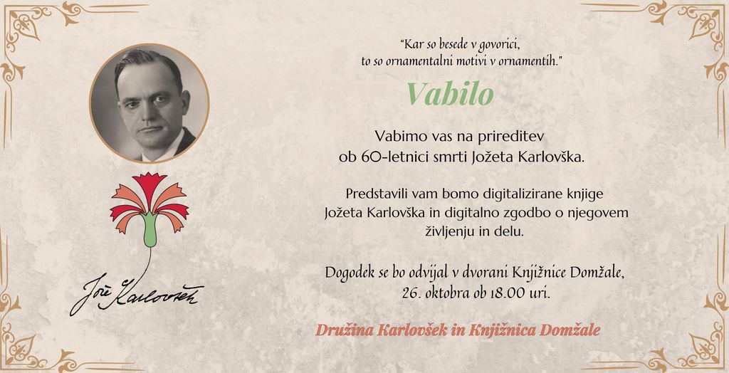 Vabimo vas, da si ogledate in preberete digitalno zgodbo o Jožetu Karlovšku in se nam pridružite v Knjižnici Domžale, v četrtek 26. oktobra ob 18. uri na druženju in obujanju spomina na Jožeta Karlovška.