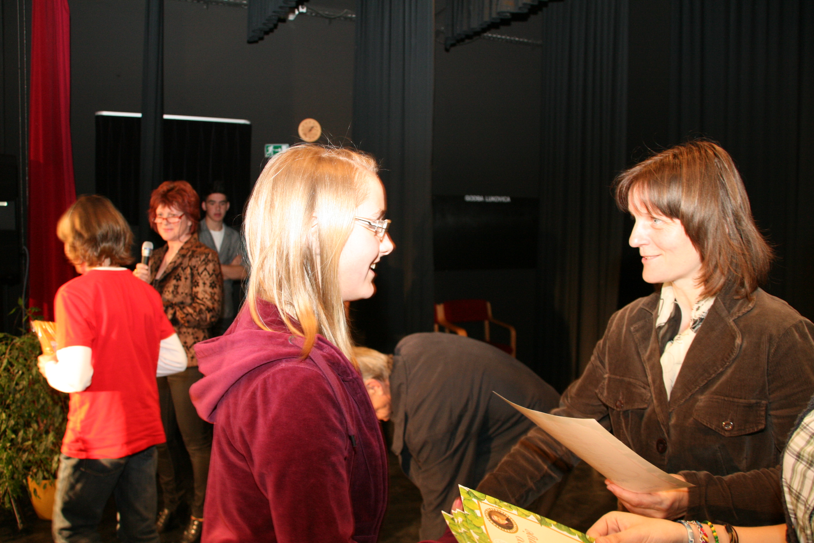knjižnici SBP. Po prvi kaseti z naslovom Gospodovo jutro je pred kratkim izdala tudi zgoščenko z naslovom Odpri mi vrata. Njene pesmi lahko pogosto slišimo na Radiu Ognjišče in so v celoti njene, saj napiše besedilo, glasbo in jih tudi zapoje in čeprav nam naši odrasli bralci niso povedali, kakšni so »iskalci dobrega«, se mi zdi, da je naša današnja gostja prav to – iskalka dobrega. Toliko so nam o avtorici povedali mladi, več o njeni poti nam je razložila sama, tudi o njeni poti za, ali z Bogom. In preden sta skupaj z domačim župnikom podelila Slomškova bralna priznanja mlajši skupini nam je Ana Meden podala nekaj podatkov o delu SBP na Brdu. Od 57 prijavljenih jih je 47 uspešno zaključilo bralno leto, 37 od njih celo z zlato nalepko, ki pomeni , da so prebrali 4, ali več knjige. Tokrat so mladi bralci prebrali 286 knjig, ali 6 knjig na bralca in od tega so jih 4 prebrali več kot 10 največ 18 knjig. Teh nekaj statističnih podatkov nam lahko pove mnogo, posebno, če se ob tem zamislimo in ugotovimo koliko knjig smo prebrali mi v zadnjem letu. Sledila je podelitev priznanj in nato še veselejši del, saj so nam Miha Vidergar, Zala, Sara in Erik Kralj Serša, povedali Slomškovo pesem Veselja dom , Benjamina Peterka pa nam je na harmoniko zaigral Veselo v Kamnik. Iz basni se lahko mnogo naučimo in tako smo se iz Slomškove basni o vevericah, orehu in podlasici, ki so nam jo predstavile Lea Bervar, Natalija Cerar, Manca Dolenc in Maja Meden, če ne že naučili vsaj spomnili na nekaj. In kako pomiriti prepir , ja tudi z glasbo gre, kajti tudi glasba je tista, ki nas razveseljuje, povezuje in odvrača od prepira. Tako je na oder stopila Doroteja Kink, ki nam je zaigrala Mozartov Vals na violino ob klavirski spremljavi Špele Kink. O čudežu življenja, ki ga je opisala naša lanskoletna gostja ob kulturnem dnevu pisateljica in pesnica Nataša Konc Lorenzutti, so deklamirali Andrej, Irenej in Jerica Bukor, ki so bili čudeža življenja deležni nedolgo nazaj, ko se jim je pridružila sestrica Marija, ki bo , če bo le malo po sestricah in bratcih čez čas tudi bralka SBP. Še podelitev priznanj starejši skupini in najstarejšim bralcem v slovo in povabilo k sodelovanju kot animatorji predaja mape z vsemi opisi knjig, ki so jih prebrali v teh letih. Pesem Gregorja Čušina Popotnica je ena takih, ki nas usmerja k temu, da smo bližje Bogu in slednjo so nam povedali Aleš Bernot, Anže Stražar in Janez Meden. Seveda nam je spregovoril tudi župnik Andrej Svete, ki ga je napovedovalec na oder povabil z spodbudnimi besedami: "Kar korajžno gospod!" in nas ob tem spomnil tudi na Janeza Pavla II. Tisto kar preberemo nam ostane v srcu in nam nobena kriza ne vzame, o vsem kar smo prebrali moramo tudi premišljevati je v svojih stavkih nagovora poudaril domači župnik. Poslovili smo se z pesmijo Mišek moj mali, ki nam jo je zapela tokratna gostja in z željo, da bralci in bralke pri branju vztrajajo in se nam pridružijo tudi naslednje leto. A naj ob koncu zapišem še misel, ki jo je gostja povedal na začetku in je bila le povzetek pogovora z patrom Žužkom malce skrajšano:« Nimam časa, da bi bral dobre knjige, jaz berem le najboljše« in zagotovo je to Sveto pismo dodajam jaz.