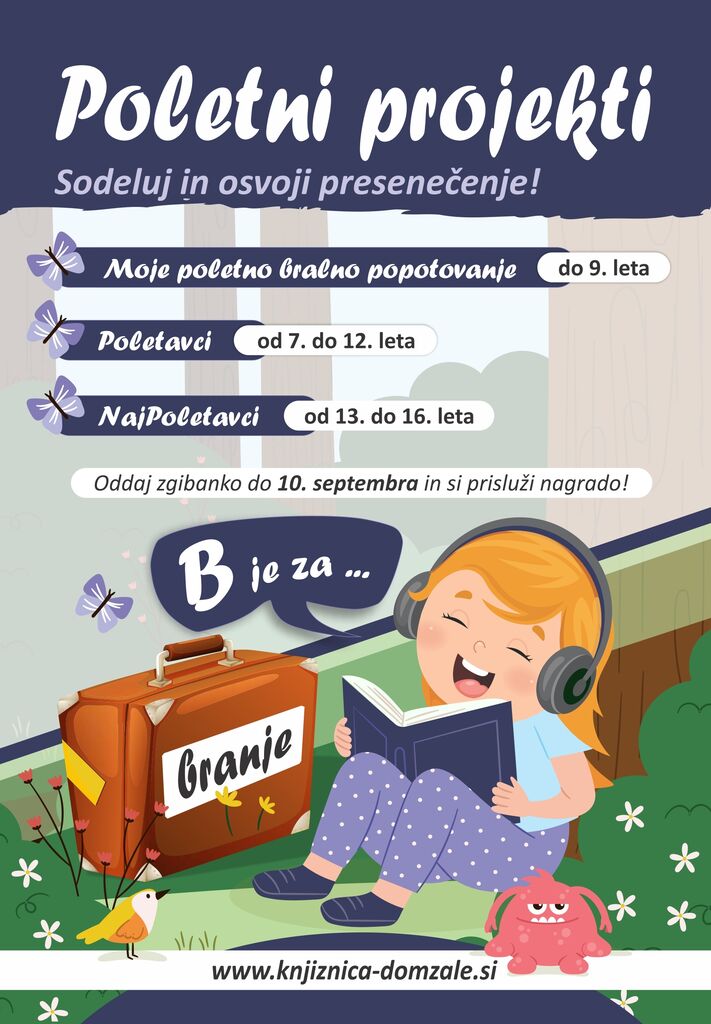 Projekti spodbujanja branja za otroke in mladino, ki jih pripravljamo med poletnimi počitnicami se počasi zaključujejo. Vsi, ki še niste zbrali vseh nalepk in/ali oddali zgibanke, vabljeni, da to storite do 10. septembra 2025. Izpolnjeno zgibanko lahko oddate v Knjižnici Domžale ali njenih enotah.