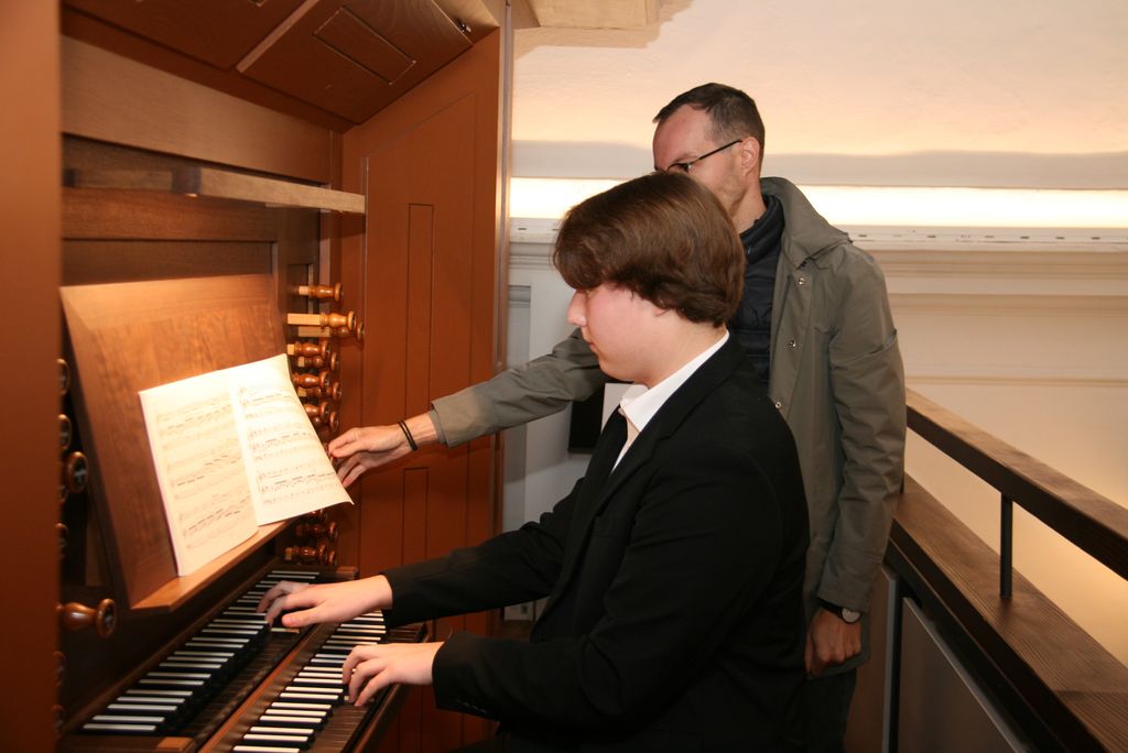 Koncert v sklopu cikla Orgle opoldne mu je podelila Glasbena šola Škofja Loka kot posebno nagrado izbranemu nagrajencu letošnjega TEMSIG-a v disciplini orgle. Poleg koncerta je ravnateljica GŠ Škofja Loka Irena Kržišnik v spomin na koncert Mihu in Urošu podelila spominsko darilo z željo, da se še kdaj odzoveta povabilu GŠ Škofja Loka in pripravita lep orgelski koncert v špitalski cerkvi. In ker so Ločani ponosni na svoje orgle smo tokrat na koncertnem listu prejeli tudi dispozicijo orgel GŠ Škofja Loka Orglarstva Močnik opus 42 -2023, ki so I. MANUAL (GLAVNO PIŠČALJE) 1. Burdon 16′ 2. Principal 8′ 3. Dvojna flavta 8′ 4. Viola da gamba 8′ 5. Oktava 4′ 6. Lesena flavta 4′ Nazard 2 2/3′ predpoteg iz 7. 7. Kornet III 2 2/3′ Oktava 2′ predpoteg iz 8. 8. Mikstura IV 2′ II. MANUAL (STRANSKO PIŠČALJE V ŽALUZIJAH) 9. Pokrit 8′ 10. Prečna flavta 8′ 11. Salicional 8′ 12. Principal 4′ 13. Flavta 4′ Kvinta 2 2/3′ predpoteg iz 14. 14. Seskvialtera II 2 2/3′ 15. Oktava 2′ 16. Karlinet [sic!] 8′ PEDAL * Subbas 16′ transmisija iz 1. * Oktavni bas 8′ transmisija iz 2. * Flavtni bas 8′ transmisija iz 3. * Pokriti bas 8′ transmisija iz 9. * Gambni bas 8′ transmisija iz 4. * Salicetni bas 8′ transmisija iz 11. * Koralni bas 4′ transmisija iz 12. 17. Pozavna 16′ * Trobenta 8′ ekstenzija iz 17. * Klarinetni bas 8′ transmisija iz 16. Pomožni register: Ptice ZVEZE Mehanske zveze v dvojni izvedbi (s potegom in stopalko): II/I, I/P, II/P TEHNIČNI PODATKI Obešena mehanska igralna traktura Mehanska registrska traktura Sapnice na poteg Obseg manualov: C–a3 (58 tipk) Obseg pedala: C–g1 (32 tipk) Uglasitev: enakomerno temperirana, a1 = 440 Hz pri 15 °C Zračni pritisk: 78 mm vodnega stolpca Klinasti meh Zapora izravnalnih mehov Tremulant
