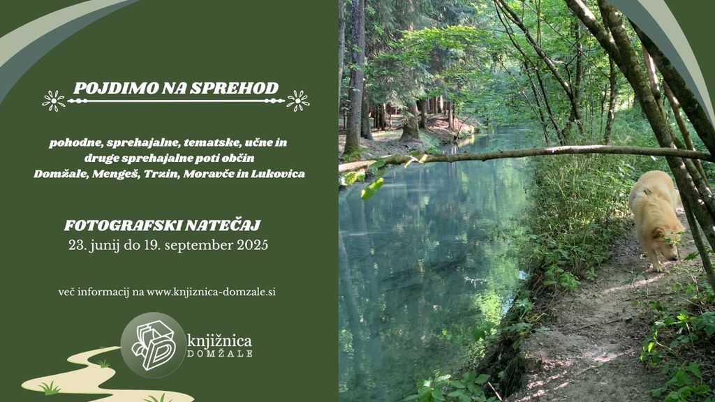 Vabimo vas, da nam pošljete fotografije vaših sprehodov po pohodnih, sprehajalnih, tematskih, učnih in drugih sprehajalnih poteh občin Domžale, Mengeš, Trzin, Moravče in Lukovica. Ne pozabite napisati kje in kdaj je bila fotografija posneta. Z natečajem želimo pokazati naše prelepe kraje, v večnost ujeti in zapisati trenutke, motive, razglede in druge zanimivosti ob sprehajalnih in pohodnih poteh v naši in sosednjih občinah. Knjižnica Domžale bo s fotografijami obogatila domoznansko zbirko, pripravila razstavo in gradivo uporabila v promocijske namene naše zbirke. Pogoji sodelovanja so objavljeni na spletni strani Knjižnice Domžale.