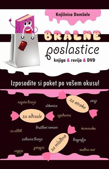 Za dobro in zanimivo branje vam ponujamo pakete izbranih knjig - BRALNE POSLASTICE. V vseh naših knjižnicah vas v zaprtih vrečkah čaka gradivo. Označili smo, kakšen žanr se skriva v vrečki. Za otroke smo navedli starost in okvirno temo vsebine. Pripravili smo knjige, revije in DVD-je. Vrečko vam izposodimo, gradivo pa boste vrnili kot običajno – v Domžalah v vračalnik, v krajevnih knjižnicah pri izposojevalnem pultu.