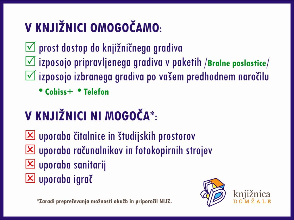 Dragi bralci, prosimo vas, da pred vstopom v knjižnico upoštevate napotke zaposlenih ter si preberete priporočila na plakatih. V knjižnico vstopajte le, če ste zdravi, med obiskom knjižnice nosite zaščitno masko in si razkužite roke – razkužila so na voljo pri vhodu v knjižnico. Upoštevajte predpisano varnostno razdaljo med obiskovalci, pregledane knjige, ki si jih ne boste izposodili, odložite na označena mesta, in če le mogoče, uporabite brezstična plačilna sredstva.
