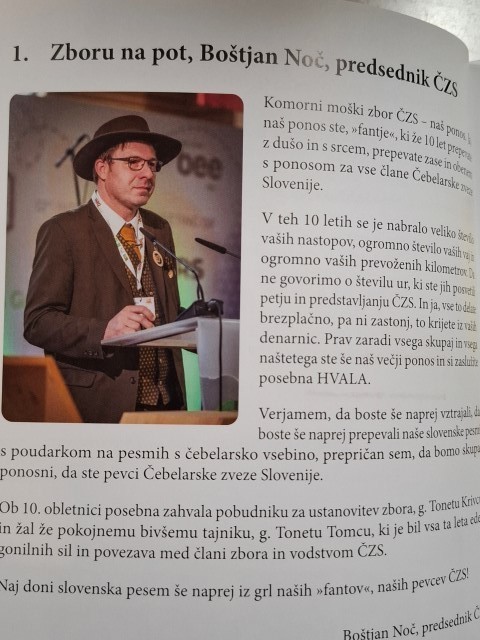V uvodniku Tone Krivec, predsednik zbora ČZS pove, kako je sploh prišlo do same ideje, kdaj ter kje. Idejo je po elektronski pošti poslal predsedniku Boštjanu Noču in še isti večer je dobil pritrdilni odgovor, da je predlog fenomenalen in, da ga je potrebno realizirati. Že v februarski številki Slovenskega čebelarja je bilo objavljeno obvestilo o ustanovitvi pevskega zbora ter povabilo čebelarjem, ki imajo veselje do petja, da se pridružijo. Na koncu se zahvali še vsem, ki kakor koli pomagajo pri delu zbora z mislijo, da je prvih deset let najtežjih.