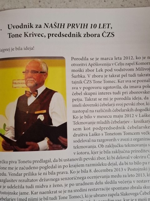 Zbornik na več kot sto straneh opisuje zgodovino zbora in je izdan zahvaljujoč se finančni pomoči donatorjev. Na začetku predstavi zbor Andrej Selan z opisom nastanka zbora od ideje Toneta Krivca in vse do realizacije. Veliko je pri tem pripomogel tudi pokojni Tone Tomec, ki je bil navdušen pevec, čebelar in uslužbenec ČZS. Z besedami Zboru na pot je svoje misli strnil tudi predsednik ČZS Boštjan Noč, ki je dejal: "Komorni moški zbor ČZS - naš ponos. Ja, naš ponos ste fantje, ki že 10 let prepevate z dušo in srcem, prepevate zase in obenem s ponosom za vse člane Čebelarske zveze Slovenije." Obenem se dotakne tudi tiste, malo boleče strani nastopov in vaj, ki se jih fantje udeležujejo; to je finančne plati. A vse to delajo zastonj in ne le to, vsi potni stroški in ostalo gre iz njihovih žepov in prav zaradi tega so ponos ter si zaslužijo poseben HVALA. V nagovoru se ozre tudi naprej v želji, da bodo vztrajali še naprej in prepevali naše slovenske pesmi, s poudarkom na pesmih s čebelarsko vsebino in, da bodo ponosni, da so pevci Čebelarske Zveze Slovenije. Ob koncu nameni še nekaj besed ustanovitelju zbora Tonetu Krivcu in že pokojnemu bivšemu tajniku ČZS Tonetu Tomcu, ki je bil vsa ta leta gonilna sila in povezava med člani zbora in vodstvom ČZS. Pevcem je zaželel naj še naprej doni slovenska pesem iz njihovih grl.