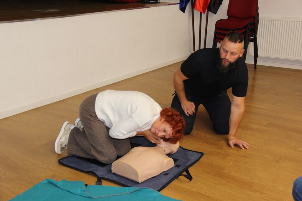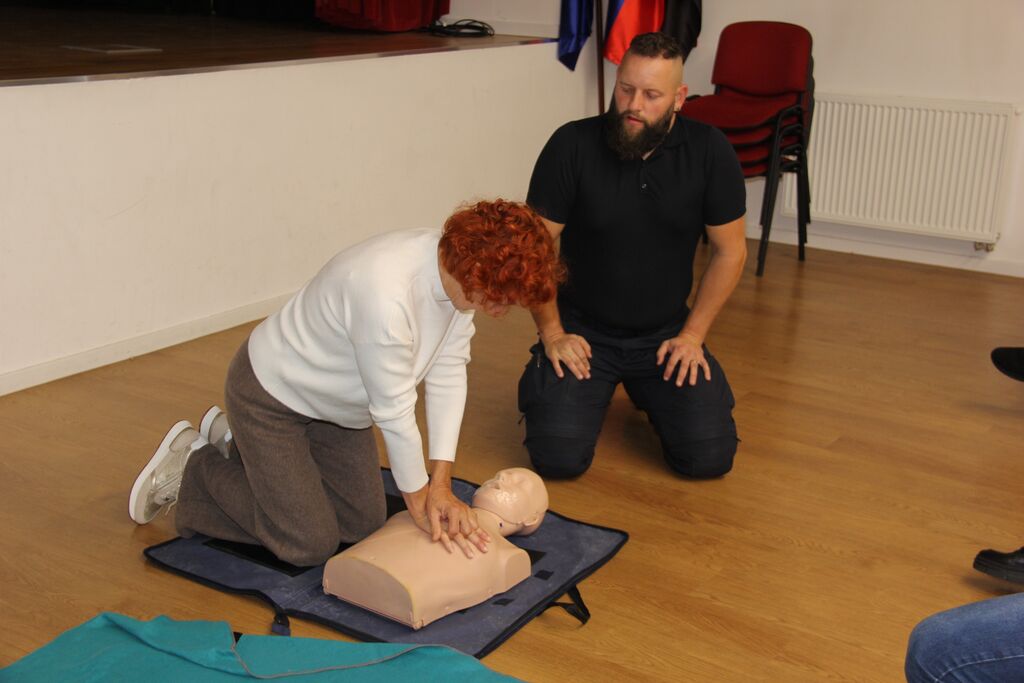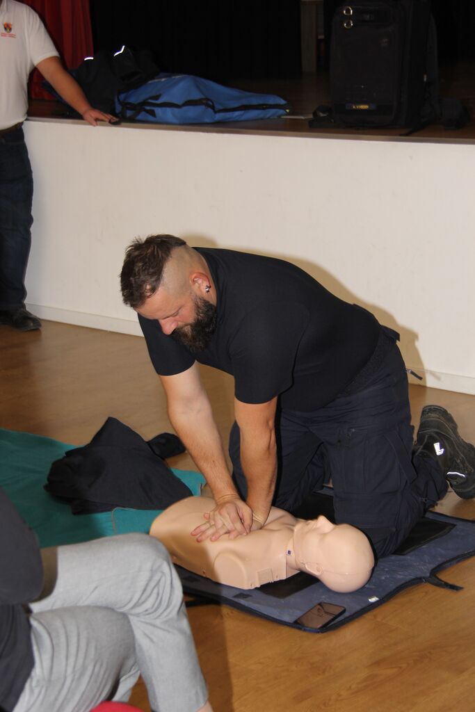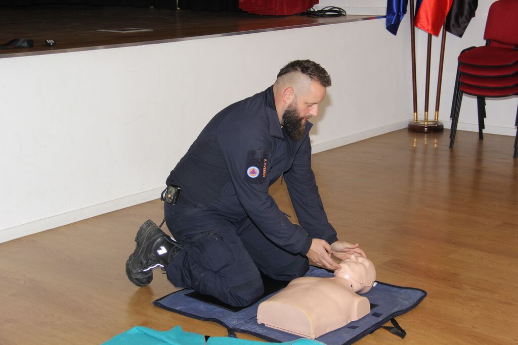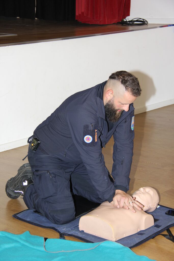 S prvo pomočjo se seznanimo ko opravljamo vozniški izpit, potem pa nič več in zato je prav, da znanje osvežimo in takšne predstavitve, kjer lahko tudi sami poskusimo oživljanje so še kako dobrodošle. In smo začeli najprej z osnovami, torej zavarovanjem ponesrečenca, klicem na 112 ter nato z izvajanjem ritmičnega pritiskanja na prsni koš in vpihavanjem zraka. Razmerje med pritiski in vpihi je 30 : 2. Začnemo s 30 pritiski, ki jim sledita 2 vpiha. To ponavljamo vse dokler oseba ne začne kazati znakov življenja, do prihoda reševalcev, ali dokler nismo povsem izmučeni. Pritiske prsnega koša izvajamo v sredini prsnega koša na spodnji polovici prsnice. Peto dlani naše dominantne roke položimo na prsnico, drugo dlan položimo preko prve in prepletemo prste rok. Globina pritiska naj bo 5-6 cm (tretjina prsnega koša), stiskamo s hitrostjo 100-120/min. Ves čas morajo biti naše dlani v stiku s prsnim košem, prav tako pa moramo biti pozorni, da omogočimo popoln razteg prsnega koša po pritisku, da se bo srce ponovno napolnilo s krvjo. Za lažje izvajanja morajo biti naši komolci iztegnjeni naše telo čim bližje ponesrečencu, da jih izvajamo s silo celega telesa, ne le rok, saj jih bomo tako lahko izvajali dlje. Ključno je, da se izogibamo vsem nepotrebnim prekinitvam pritiskov prsnega koša. Vsak trenutek, ko pritiskov ne izvajamo, možgani ne dobivajo kisika. Vpiha, izvedemo tako, da s prsti roke zatesnimo nosnici, nato pa s svojimi usti objamemo usta ponesrečenca in enakomerno vpihujemo eno sekundo – toliko, da se prsni koš dvigne.