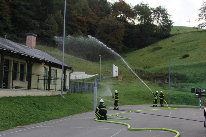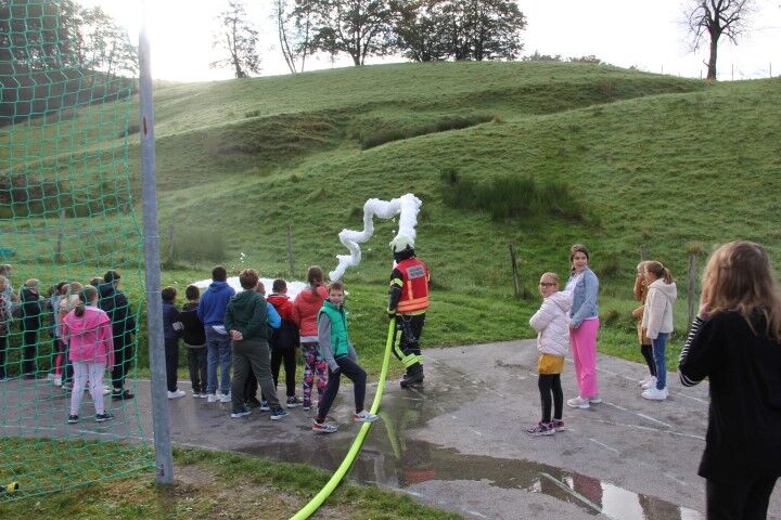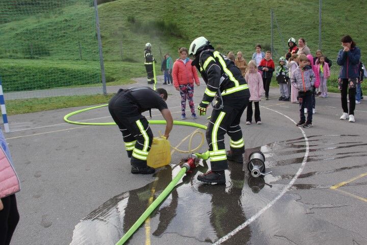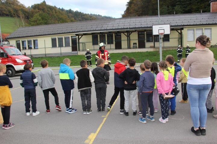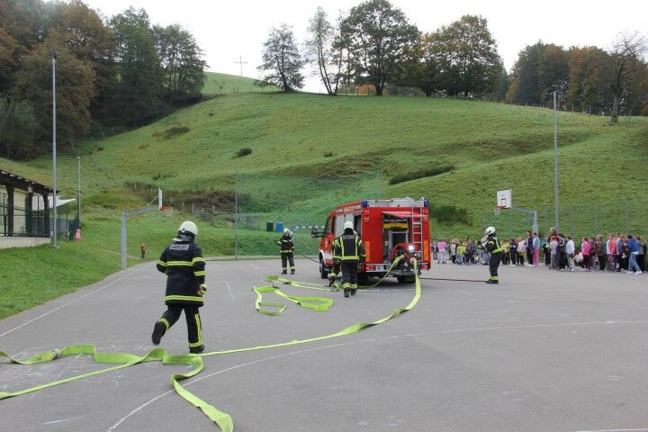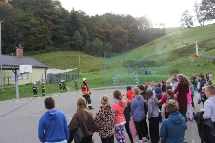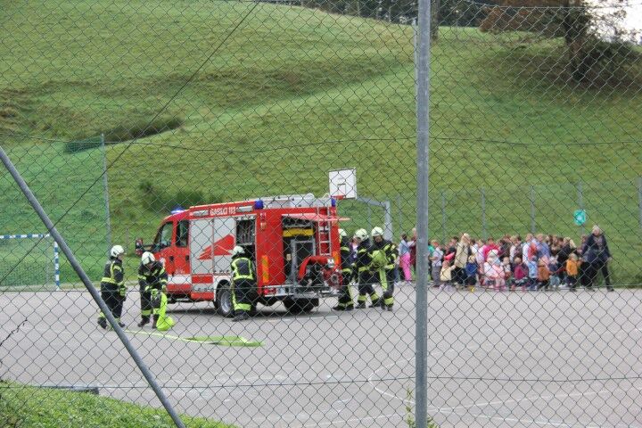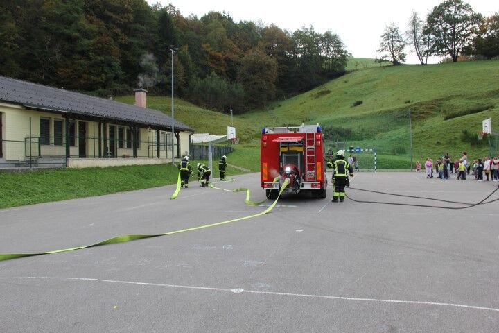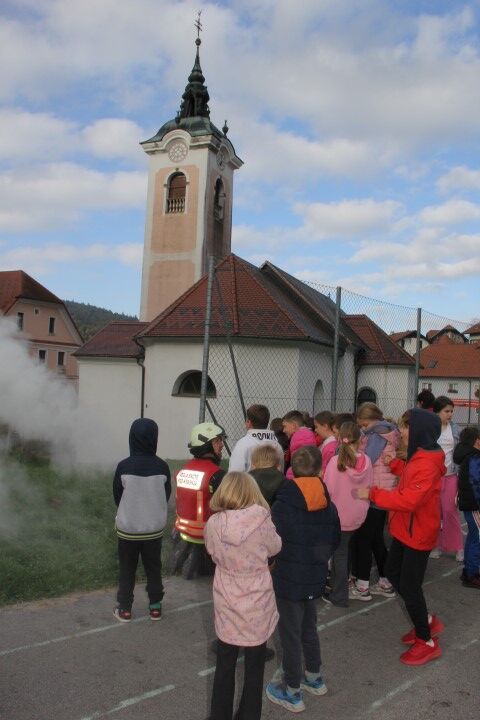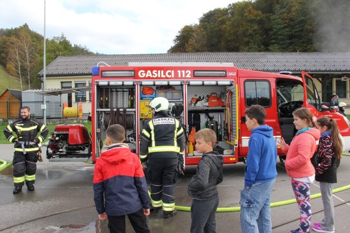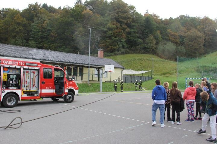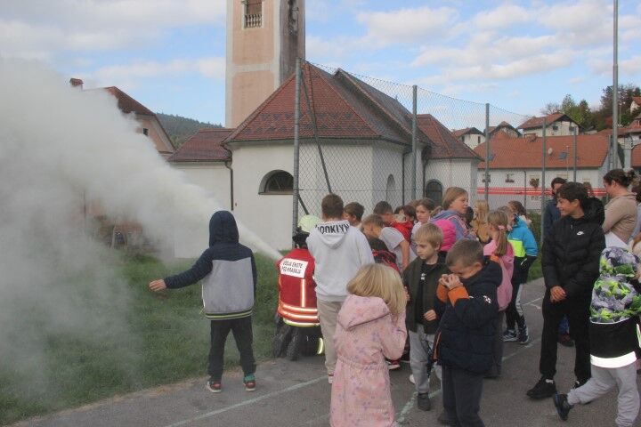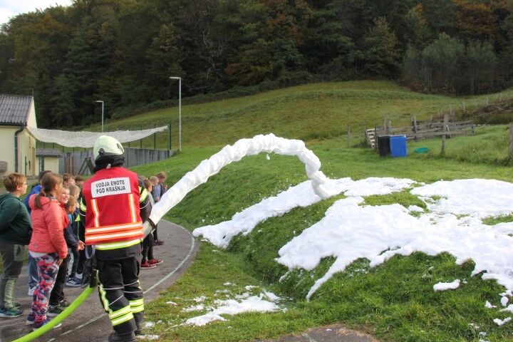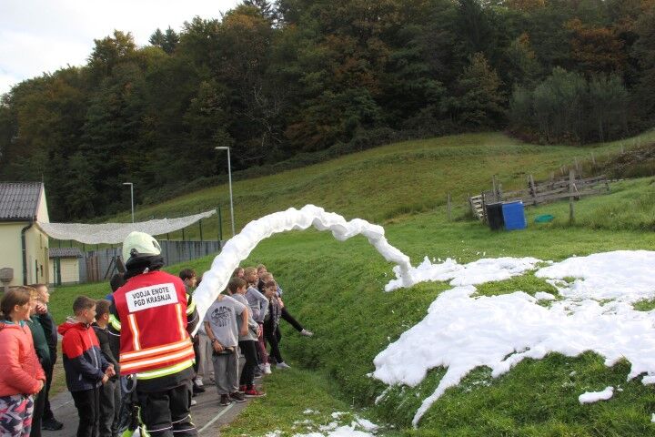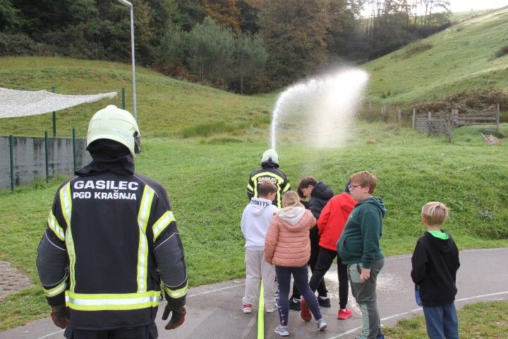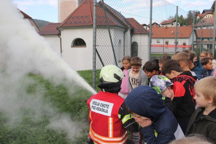 Med tem, ko so učenci in učenke skupaj z vrtčevskimi otroci in osebjem zapuščali prostore se je že oglasila sirena na gasilske domu v Krašnji. Odzivnost je pomemben faktor pri požarih in tako so gasilci in gasilke stopili v akcijo, požar omejili in na koncu tudi pogasili. Nato je sledil teoretični del, kjer so se učenci še enkrat seznanili s požarnim redom, spoznali so ga že prvi dan, ko so vstopili v novo šolsko leto in z osnovnimi postopki pri požaru. Po opravljenem teoretičnem delu so se seznanili še z opremo gasilca in gasilke, opremo, ki jo vsebuje gasilsko vozilo ter spoznali določena orodja namenjena gašenju in reševanju. Seveda so lahko tudi gasili, najprej z vodo, nato s prahom in na koncu še s peno.