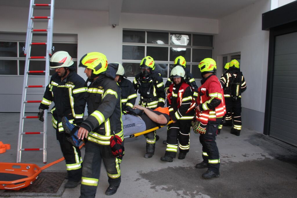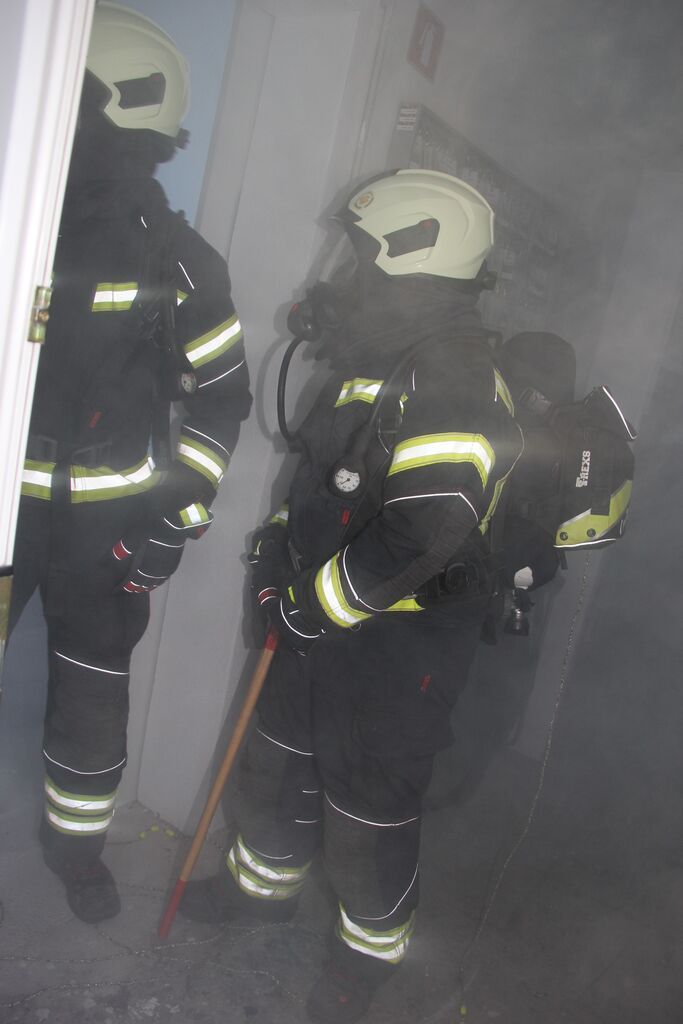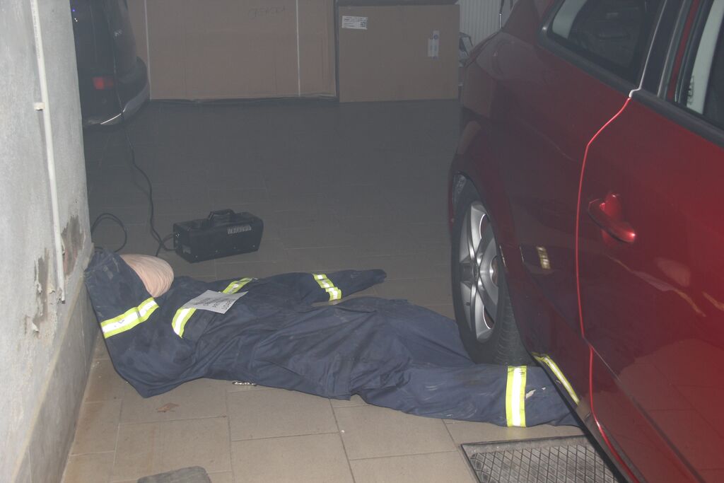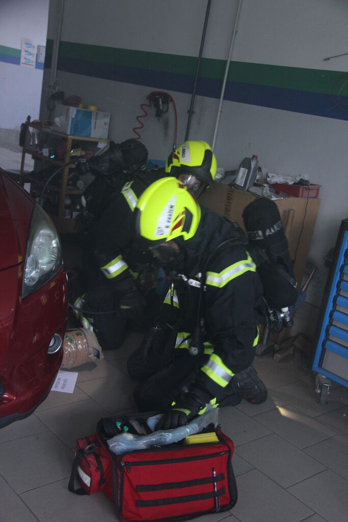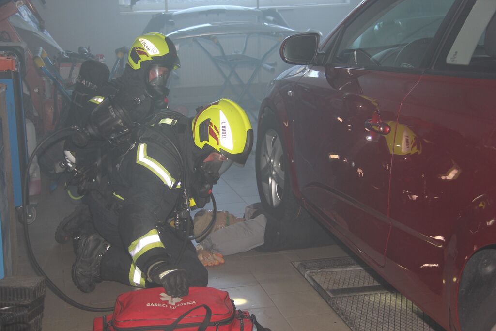 Kar nekaj ponesrečenih je bilo v sami zgradbi, a se zaradi slabe vidljivosti zaradi dima ni dalo ugotoviti kje so, zato so uporabili termo kamero. V poslopje so vstopili gasilci z izolirnimi dihalnimi aparati in nudili pomoč ponesrečencem. Ob pomoči ostalih gasilcev so jih prenesli na zbirno mesto, kjer so jim nudili prvo pomoč. Nekatere poškodovance so morali s specialno tehniko najprej rešiti izpod vozil in jih šele nato odnesti iz prostora. A so poškodovanim že takoj ob prihodu dali dihalni aparat, da so lahko dihali v sobi polni dima. V veliko pomoč so bili tudi ventilatorji, ki so dovajali svež zrak v prostore. Potem, ko so odnesli vse ponesrečene in jim nudili prvo pomoč, so pogasili še najmanjši ogenj in vaja je bila končana.