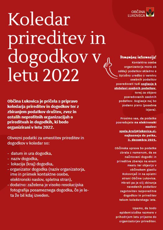 Občina Lukovica je pričela s pripravo koledarja prireditev in dogodkov ter z zbiranjem podatkov društev, zvez in ostalih neprofitnih organizacijah o prireditvah in dogodkih, ki bodo organizirani v letu 2022.