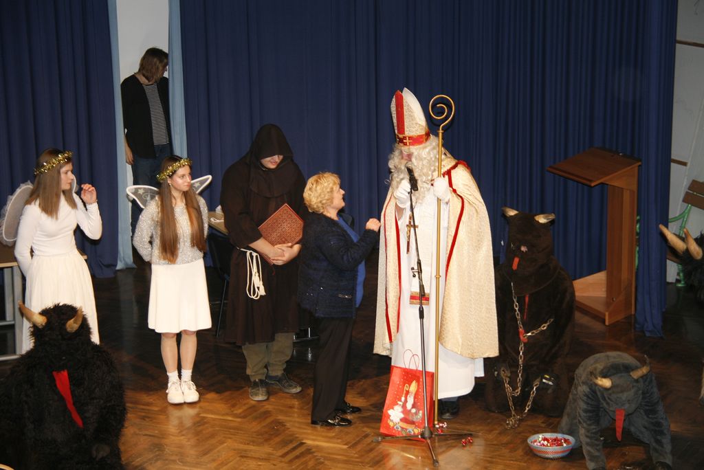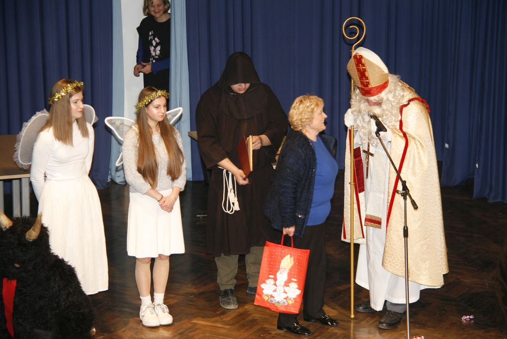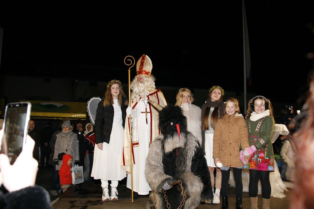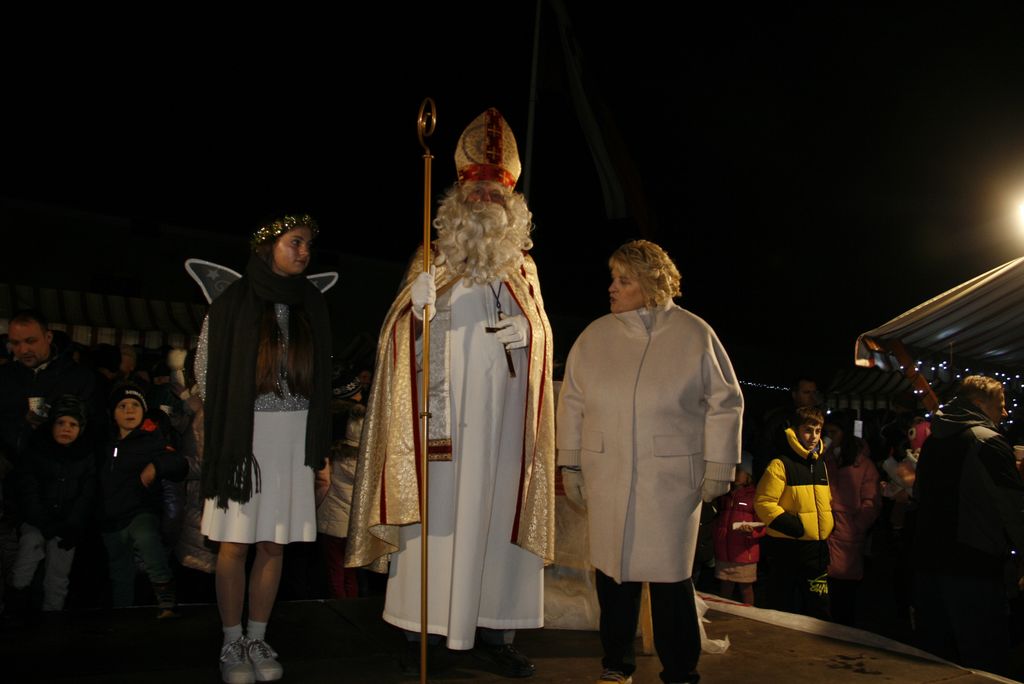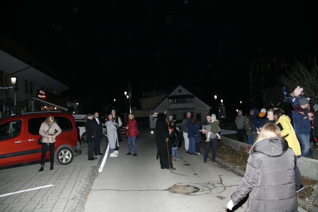 Prišli so ta grozni, ali parkeljni, angelčki, sveti Anton, ki zapisuje dobra in slaba dela v knjige in nato še sveti Miklavž. Kratkemu pozdravnemu nagovoru je že sledilo prvo srečanje z veroučenci prvega razreda. Ti so zapeli kar dve pesmici, da se je svetemu Miklavžu kar smejalo, a sveti Anton je med tem vseskozi nekaj po knjigi brskal in pisal, a so veroučenci vseeno prejeli darila. Sledil je drugi razred verouka in tudi ti so zapeli in tudi tu je bil sveti Miklavž zelo vesel in nasmejan. Peli so tako lepo in dobro, da so se še angelčki in parkeljni pozibavali v ritmu pesmi. A ni obdaril le otrok, tisti od enega leta dalje do prvega razreda so prišli na vrsto takoj zatem, ko je k sebi poklical županjo mag. Olgo Vrankar, da se ji zahvali za pomoč, ki jo občina nameni za darila, ki jih tokrat daje. Županja ne bi bila županja, če ga ne bi takoj pocukala za rokav in ga pobarala, če bi še prišel na prireditveni prostor, da skupaj prižgeta praznične lučke. In kako bi drugače kot, da je obljubil, da pride, le še župnika Bernarda in ostale pridne otroke obdari.
