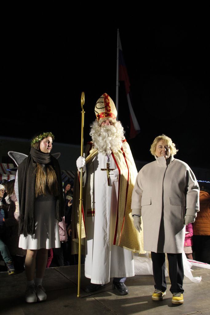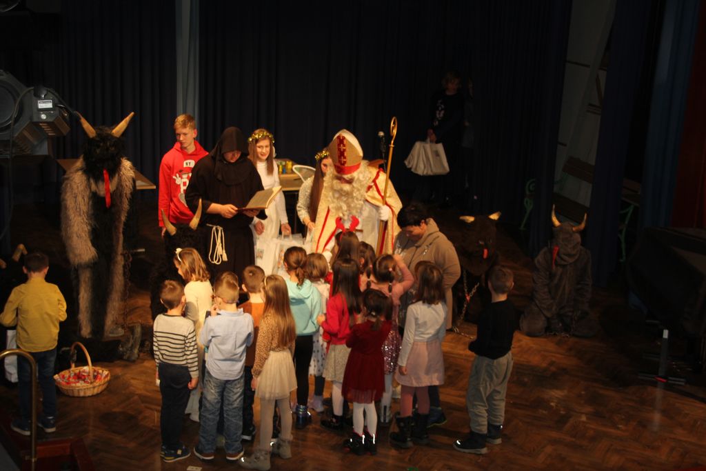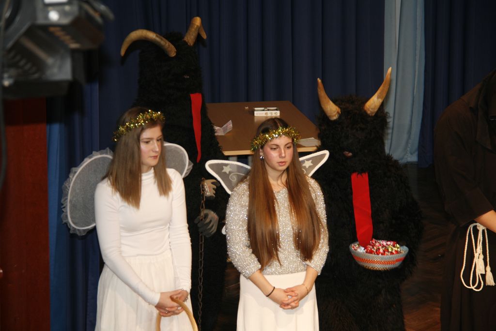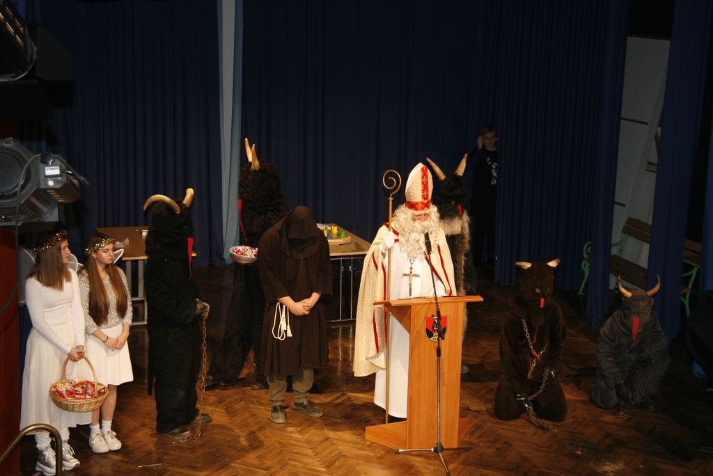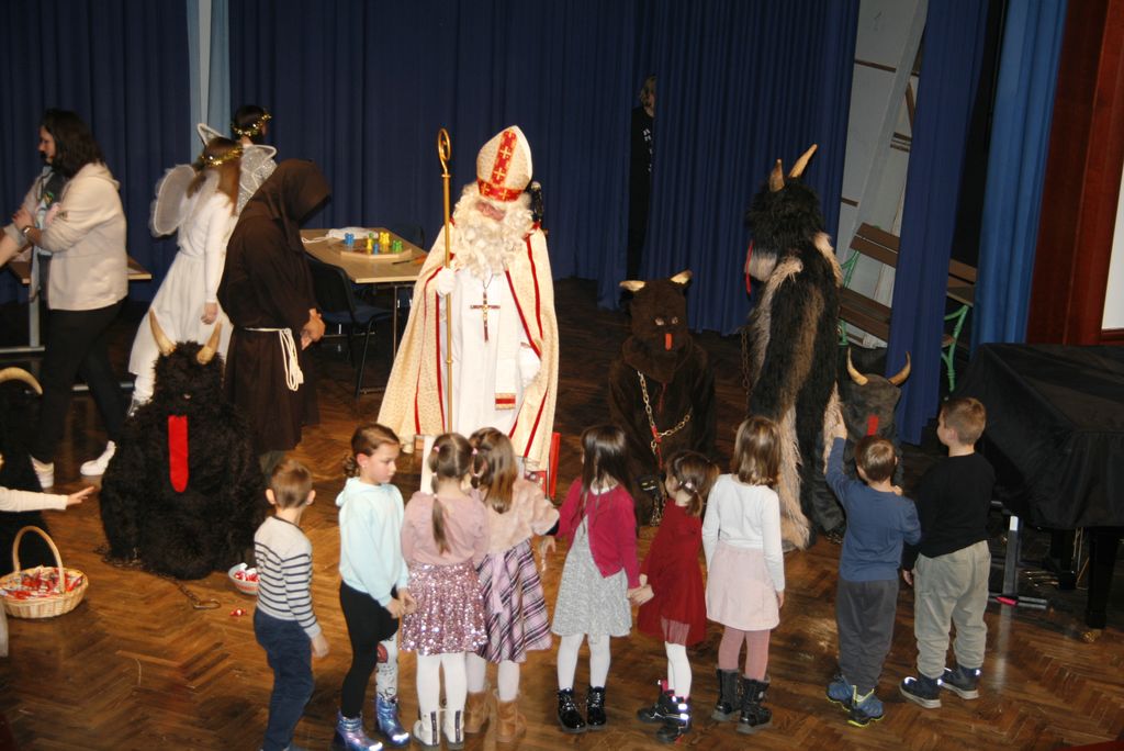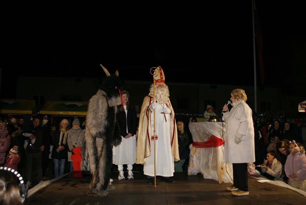Prišli so ta grozni, ali parkeljni, angelčki, sveti Anton, ki zapisuje dobra in slaba dela v knjige in nato še sveti Miklavž. Kratkemu pozdravnemu nagovoru je že sledilo prvo srečanje z veroučenci prvega razreda. Ti so zapeli kar dve pesmici, da se je svetemu Miklavžu kar smejalo, a sveti Anton je med tem vseskozi nekaj po knjigi brskal in pisal, a so veroučenci vseeno prejeli darila. Sledil je drugi razred verouka in tudi ti so zapeli in tudi tu je bil sveti Miklavž zelo vesel in nasmejan. Peli so tako lepo in dobro, da so se še angelčki in parkeljni pozibavali v ritmu pesmi. A ni obdaril le otrok, tisti od enega leta dalje do prvega razreda so prišli na vrsto takoj zatem, ko je k sebi poklical županjo mag. Olgo Vrankar, da se ji zahvali za pomoč, ki jo občina nameni za darila, ki jih tokrat daje. Županja ne bi bila županja, če ga ne bi takoj pocukala za rokav in ga pobarala, če bi še prišel na prireditveni prostor, da skupaj prižgeta praznične lučke. In kako bi drugače kot, da je obljubil, da pride, le še župnika Bernarda in ostale pridne otroke obdari.