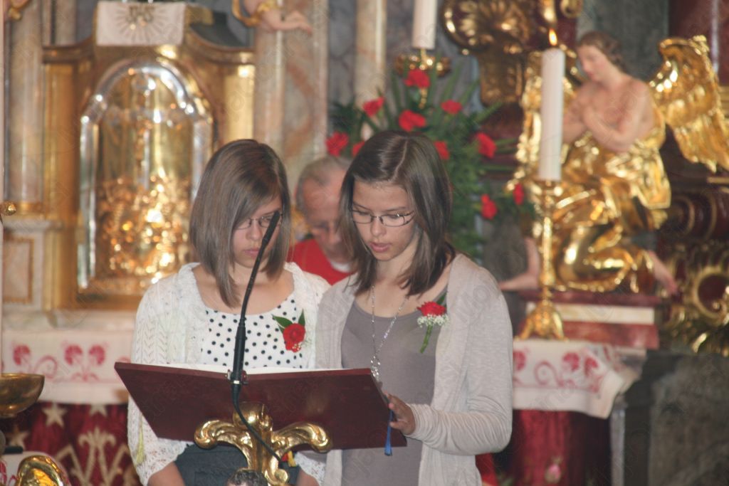 Navajeni smo že, da se nam ob 10 sveti maši na Binkošti pridružijo v cerkvi tudi naši starejši in bolni farani in letos ni bilo nič drugače. A vendar, če nam je pri  jutranji maši na binkoštni praznik spregovoril domači župnik Andrej Svete,  o ognju, ki v mnogih kulturah velja za nekaj svetega, saj prihaja iz neba, smo tokrat prisluhnili nagovoru duhovnega pomočnika Ivana Povšnarja in domačega župnika. Če je prvi nagovoril vse zbrane, je drugi dal nekaj napotkov vsem tistim, ki se tokrat podajajo na pot odraščanja, saj končujejo tako osnovno kot veroučno šolo. O tem kako so bili učenci zbrani v dvorani zadnje večerje okoli Device Marije in v nenehni molitvi pričakovali prihod Svetega Duha. Ob prihodu so srca učencev zbranih v binkoštni dvorani  zagorela v veliki ljubezni do Boga in to se dogaja še danes. Papež Benedikt XVI. prosi naj Sveti Duh navdihuje pogumne pobude za mir in naj podpira prizadevanja, da bo dialog prevladal nad orožjem, spoštovanje človekovega dostojanstva pa prevladalo nad pristranskimi interesi, je  poudaril duhovni pomočnik.  Andrej Svete je namenil  učencem devetih razredov osnovne šole, ki so končali šolanje tele besede. Sveti duh, ki je danes prišel nad učence v podobi plamenov, naj ostane nad vami tudi na vaši poti. Binkoštni plameni vedno naj  živijo v vas in kar ste prejeli v teh devetih letih naj vam daje notranji žar in zato bodite tisti, ki imajo radost in veselje in to pokažite tudi na zunaj. Ostanite ljudje žarečih oči, saj izžarevate življenje, veselje in pozornost. Bodite dobri  in veseli drug drugega, čeravno včasih to ni prav lahko, naj nas rdeča barva liturgičnih oblačil spominja na notranjo žerjavico, ki jo nosimo v sebi. Po končani sveti maši so bili prav vsi povabljeni na agape in tako so se starejši, kakor mlajši zadržali pred župniščem ob pogostitvi članov in članic Karitas in med njimi je stekel prav prijeten pogovor, kljub letom razlike, mogoče pa je k temu pripomogla tudi binkoštna nedelja praznik Svetega Duha.