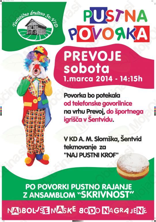 V soboto, 1. marca pridite na zdaj še skoraj tradicionalno pustno povorko, ki se bo začela pri govorilnici na vrhu Prevoj ob 14.15, potem se bodo pa vse maškare v slavnostni povorki sprehodile do igrišča v Šentvidu.