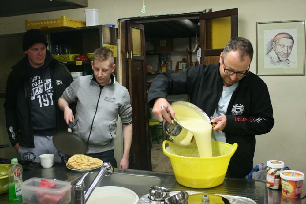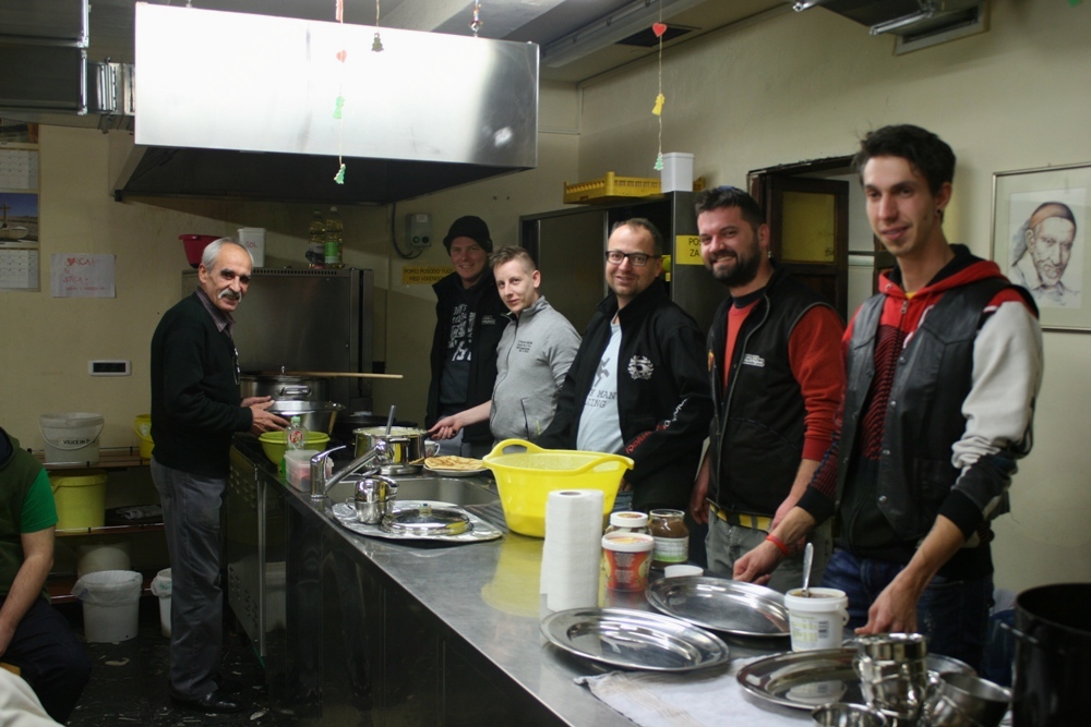 Na zelo mrzlo sredo popoldne smo tako pomagali pri pripravi večerje za predvidenih 70 brezdomcev - približno toliko jih vsak dan sprejmejo in jim omogočijo topel obrok. Da pa je bila večerja (rižota) še okusnejša, smo zraven pripravili še palačinke. V prostorih zavoda se je že popoldne nabralo kar nekaj ljudi, ki so se prišli pogreti v tople prostore. Tako smo del popoldneva preživeli ob družabnih igrah s kralji ulice. Skupaj z vodjo kuhinje, dvema prostovoljcema in osmimi rokovnjači smo pripravili obrok, razdelili vsem prisotnim prvo rundo in še »repete« za vse zainteresirane, dokler mase za palačinke ni zmanjkalo. Verjetno ni treba posebej razlagati o utrujenih in hvaležnih pogledih brezdomcev, ki so prišli na večerjo. Bogata izkušnja nam je vsem vlila dodatne motivacije in ljubezni do življenja, saj nam je ob polnih hladilnikih prevečkrat samoumevno, da imamo vsega dovolj in preveč. Vsem vam in našim novim prijateljem želimo mirne praznike ter veliko razumevanja in sočutja v novem letu!