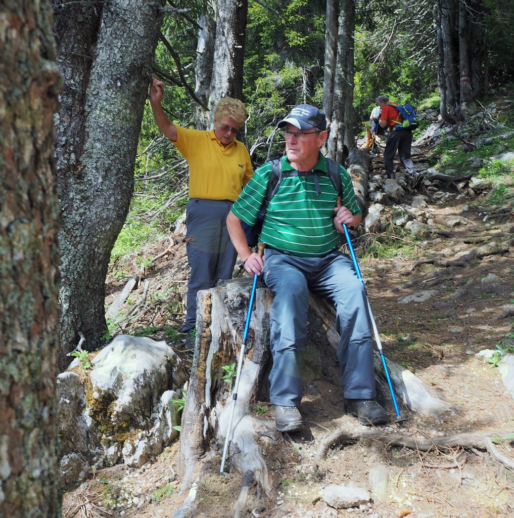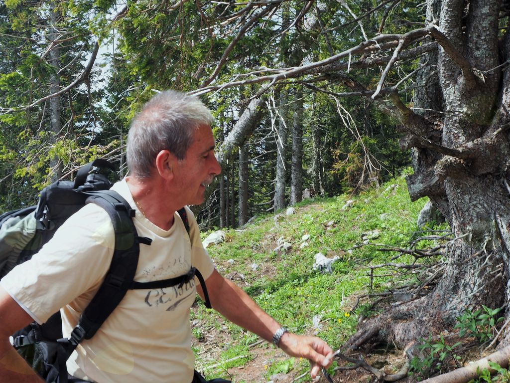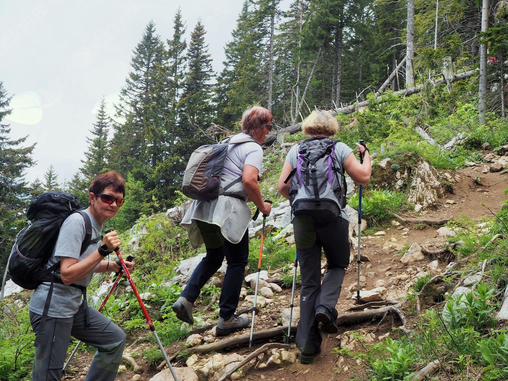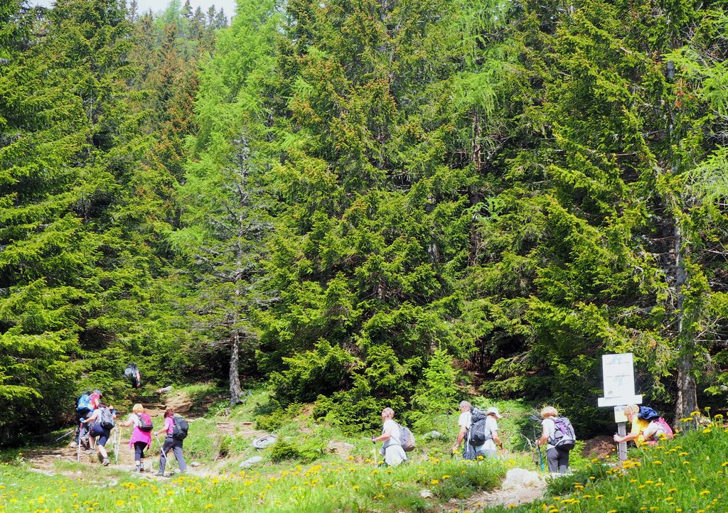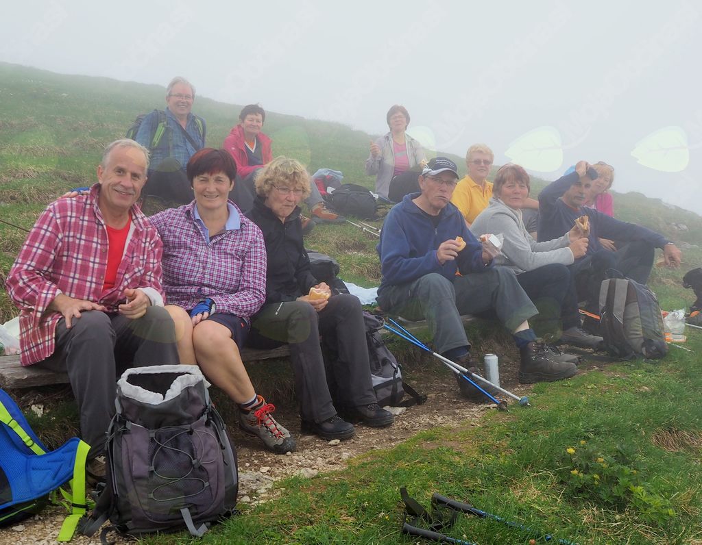 V Železni Kapli smo nekoliko zgrešili pot na pogorje Obirja, vendar smo se kmalu uspešno povzpeli na najvišji vrh Ojstrc (Hochobir)  z nadmorsko višino 2139 m od izhodiščne točke Kapelske koče (1553 m), od koder smo hodili proti vrhu  dobri dve uri. Ojstrc se nahaja zahodno od Železne Kaple (Eisenkappel) na avstrijski strani Karavank. Na naravoslovni poti proti vrhu so nas table opozarjale na strukturo tal in rastja, ter opisovale vrste drevja (drevo kot svetilnik – odlomljen vrh zaradi strele…) in bogatega rastlinja. Uživali smo v pogledih na krasne encijane, murke, vetrnice, pljučnik in ostale lepe cvetlice v deželi ruševca. Ob srečevanju s planinci so nas pozdravljali medkulturno z Grüß Gott in Servus, mi pa z dober dan. Na vrhu je postavljen križ in meteorološka postaja, kjer je lep razgled na severna ostenja Košute, del Kamniških in Savinjskih Alp, proti severu pa se vidi Mali Obir (Kleinobir) in del Dravske doline, ki se je pokazala le ob odmiku oblakov, ko jo je obsijalo sonce. Po malici in slikanju na vrhu se je pooblačilo in mrzel dež s točo nas je napodil nazaj v dolino. Voditeljica odprave Marijana nas je varno usmerjala.