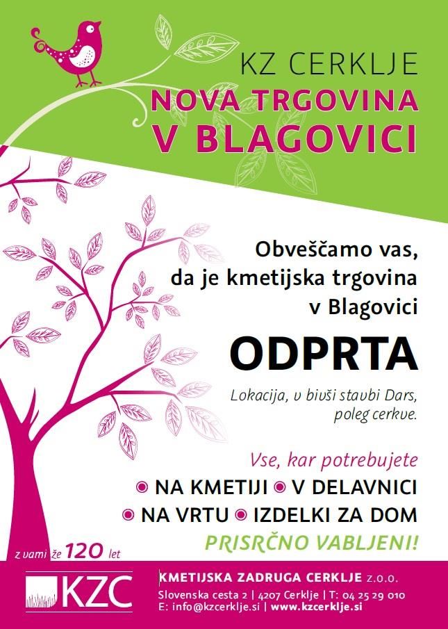 sporočamo vam, da se v Blagovici odpira nova kmetijska trgovina Kmetijske zadruge Cerklje, v ponedeljek, 4. maja 2020