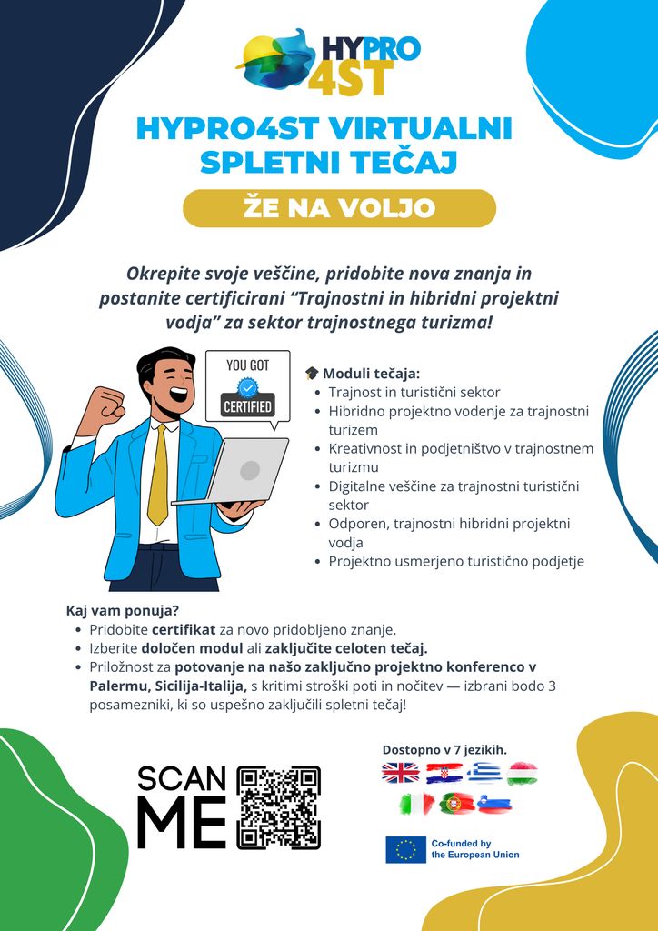 Na voljo je brezplačno spletno izobraževanje, ki je namenjeno vsem zaposlenim v turizmu in tistim, ki želite stopiti na to pot. Program je oblikovan v okviru evropskega projekta HyPro4ST, ki spodbuja razvoj ključnih kompetenc za vodenje projektov v eni najpomembnejših panog prihodnosti – trajnostnem turizmu.