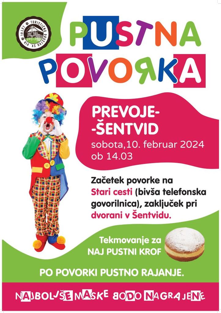 TD sv. Vid vas vabi na PUSTNO POVORKO, ki bo potekala v soboto, 10. februarja 2024, ob 14.03 uri na Prevojah pri Šentvidu.