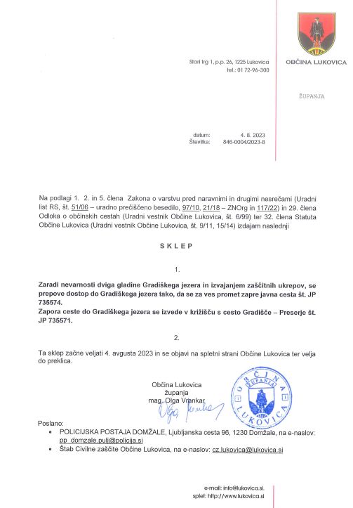 Zaradi nevarnosti sviga gladine Gradaškega jezera in izvajanjem zaščitnih ukrepov, se prepove dostop do Gradiškega jezera tako, da se za ves promet zapre javna cesta št. JP 735574.