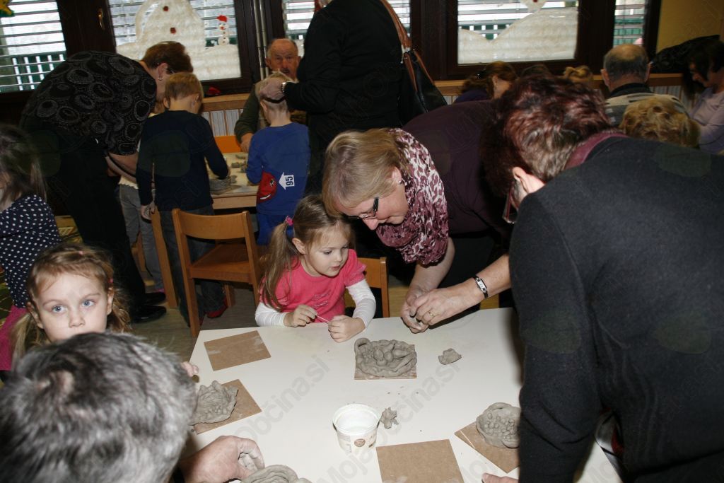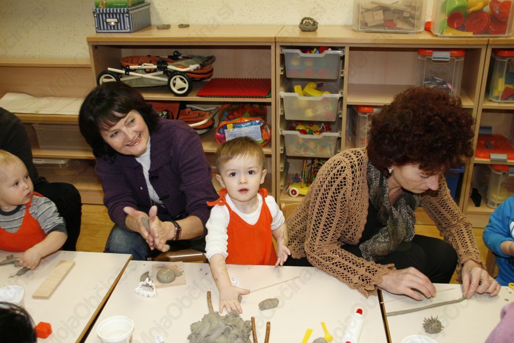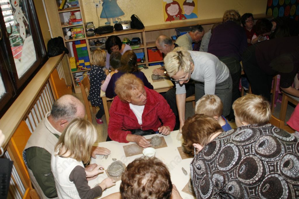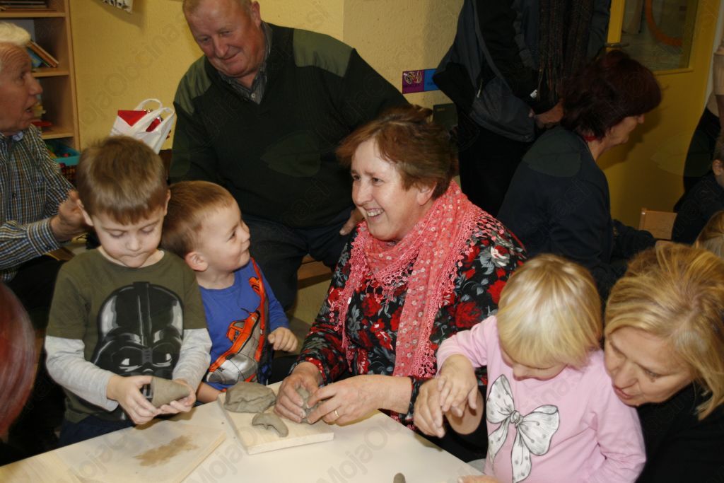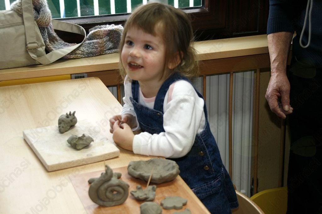 Ustvariti nekaj iz gline pa le čisto preprosto. Pa vendar so se otroci iz vrtca Medo v Krašnji spopadli z oblikovanjem gline ob pomoči babic in dedkov, saj so upali, da oni že vedo kako se kaj lepega naredi. Po pozdravnem nagovoru so se odpravili vsak k svojim vnučkom v igralnico in pričeli z delom. Malce je spominjalo na tisto znano reklamo mi pa gnetemo,  režemo ....čeprav je bila glina, ki  jo  prispevalo pečarstvo Avbelj, ravno pravšnja za obdelavo, le kakšna kapljica vode je bile še kako dobrodošla. Pa so nastajale posodice, kače, polži, gosenice, zrasli so snežaki in drugi možici, nastalo je  sadje in druge dobrote, ter nešteto zanimivih stvari, ki jih lahko rodi le domišljija in spretna roka babic in dedkov. Izdelke je bilo potrebno še podpisali ,da se bo vedelo čez leta kdo je bil umetnik. In ker smo delali smo si zaslužili tudi malico. Ja to pa je nekaj, če se lahko igraš pa dobiš potem še malico in kavico. Ker se v vrtcu v Krašnji vedno kaj dogaja so nas tokrat popeljali še po razstavi starih predmetov. Da pa babice in dedki niso kar tako so svojim vnukom in vnukinjam ter vzgojiteljicam tudi zapeli in to pesmi, ki so jih znali tudi otroci. Kako ne,saj jim jih doma dedki in babice večkrat zapojejo. Prijetno druženje smo zaključili z nakupom čestitk in prejemom simboličnega darila v spomin na naše srečanje. Da ne pozabim, piškoti so bili izvrstni. Bravo otroci in vzgojiteljice zaradi njih bom še prišel v vrtec.