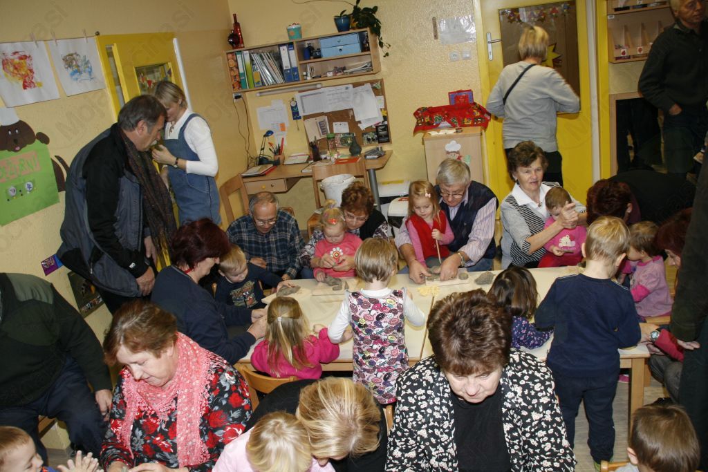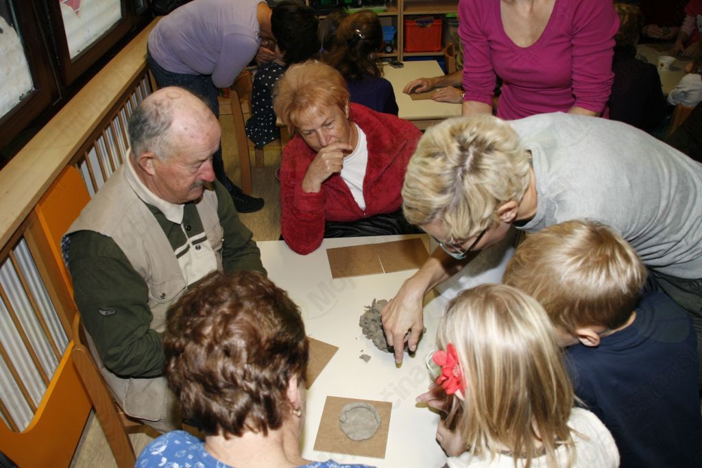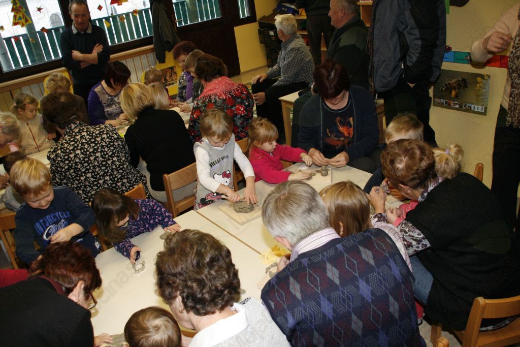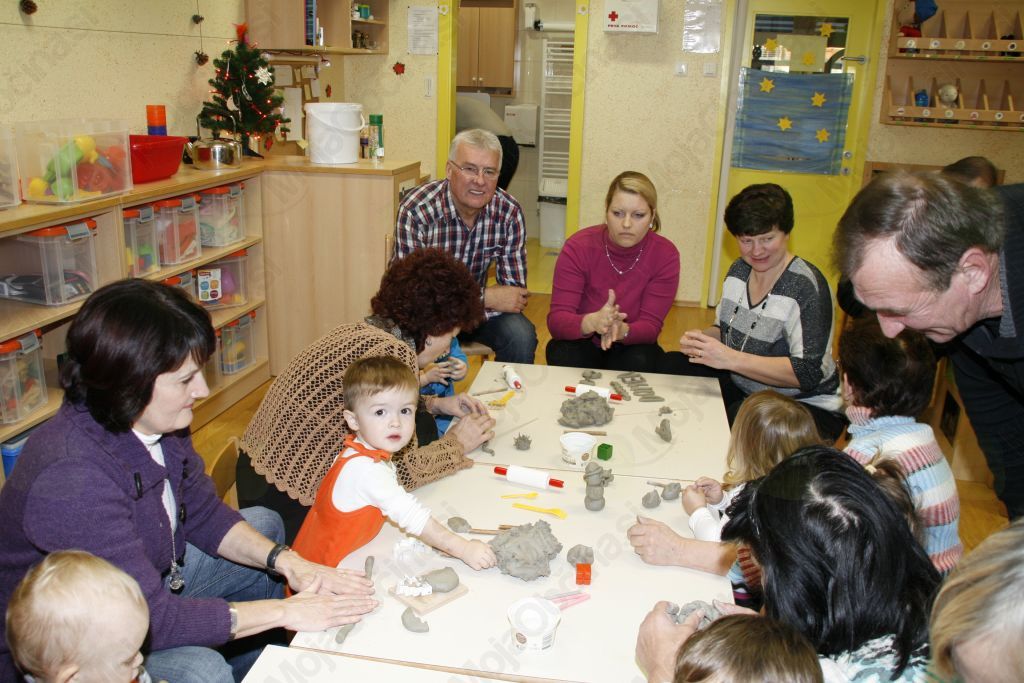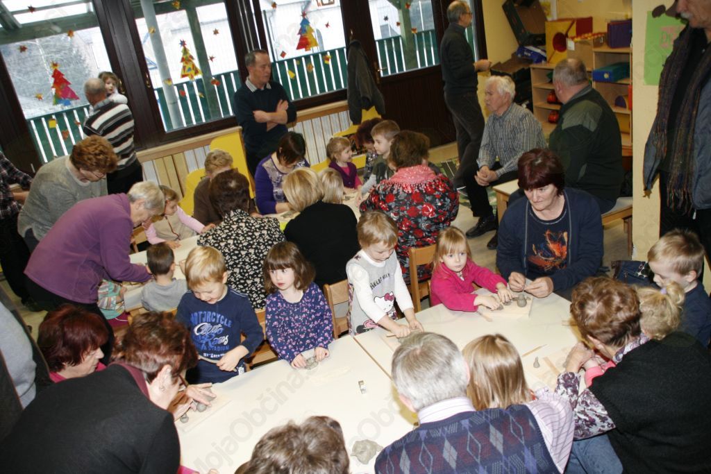 Ustvariti nekaj iz gline pa le čisto preprosto. Pa vendar so se otroci iz vrtca Medo v Krašnji spopadli z oblikovanjem gline ob pomoči babic in dedkov, saj so upali, da oni že vedo kako se kaj lepega naredi. Po pozdravnem nagovoru so se odpravili vsak k svojim vnučkom v igralnico in pričeli z delom. Malce je spominjalo na tisto znano reklamo mi pa gnetemo,  režemo ....čeprav je bila glina, ki  jo  prispevalo pečarstvo Avbelj, ravno pravšnja za obdelavo, le kakšna kapljica vode je bile še kako dobrodošla. Pa so nastajale posodice, kače, polži, gosenice, zrasli so snežaki in drugi možici, nastalo je  sadje in druge dobrote, ter nešteto zanimivih stvari, ki jih lahko rodi le domišljija in spretna roka babic in dedkov. Izdelke je bilo potrebno še podpisali ,da se bo vedelo čez leta kdo je bil umetnik. In ker smo delali smo si zaslužili tudi malico. Ja to pa je nekaj, če se lahko igraš pa dobiš potem še malico in kavico. Ker se v vrtcu v Krašnji vedno kaj dogaja so nas tokrat popeljali še po razstavi starih predmetov. Da pa babice in dedki niso kar tako so svojim vnukom in vnukinjam ter vzgojiteljicam tudi zapeli in to pesmi, ki so jih znali tudi otroci. Kako ne,saj jim jih doma dedki in babice večkrat zapojejo. Prijetno druženje smo zaključili z nakupom čestitk in prejemom simboličnega darila v spomin na naše srečanje. Da ne pozabim, piškoti so bili izvrstni. Bravo otroci in vzgojiteljice zaradi njih bom še prišel v vrtec.