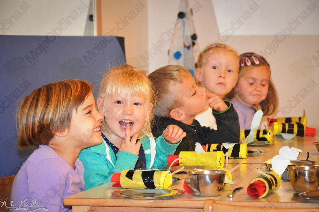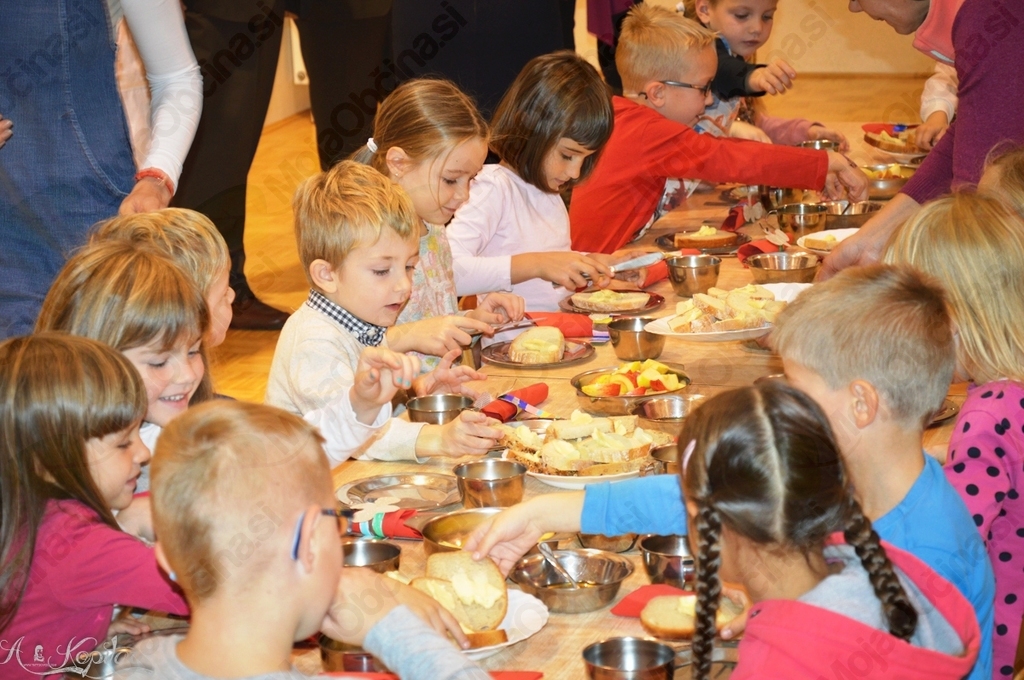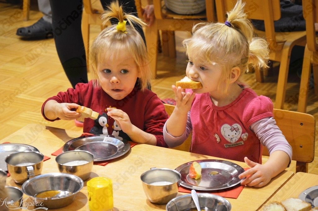 Otroci iz vrtca Medo so skupni zajtrk sprejeli z navdušenjem. V novem delu vrtca so za otroke, pred zajtrkom, pripravili še prav posebno presenečenje. Jure, ki obiskuje vrtec v skupini Ježkov je na harmnoniko zaigral vse tri pesmice, ki se jih je naučil do sedaj in med vrstniki požel buren aplavz. A klub primerni overturi v slovenski zajtrk, nekateri malčki niso mogli počakati do konca pesmi in so že vmes začeli z mazanjem masla in domačega medu na svež kruh. Kako lepo je opazovati otroke, ki se sami trudijo s pripravljanjem svojega zajtrka in ga potem z največjim užitkom zmažejo. Pa tudi, če kruh ni popolno namazan in med v potokih teče po rokah. Tako je za njih še lepše, bolj doživeto.