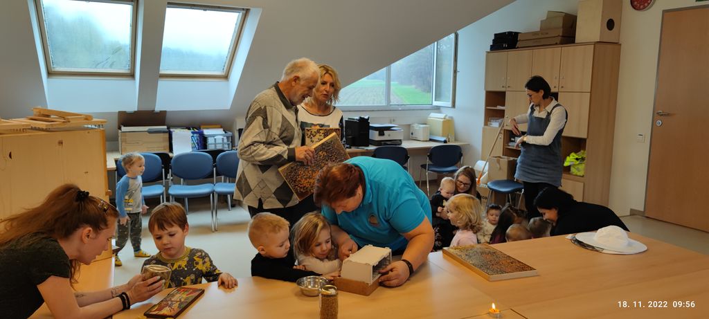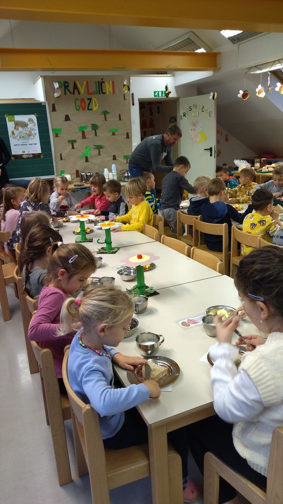 Na ta dan smo otrokom postregli za zajtrk tradicionalna živila kot so med, maslo, mleko, kruh in jabolka. Zajtrk smo pripravili malo drugače. Skupine so se združile, si pripravile pogrinjke na teme čebelic, mleka in jabolk. Tudi letos so se na naše povabilo odzvali čebelarji Čebelarskega društva Lukovica in nas obiskali. Skupaj z nami so pozajtrkovali in nam nato predstavili delo čebelarja. Otroci so si ogledali pripomočke, poskusili čebelje izdelke in spoznali tudi čebelice.