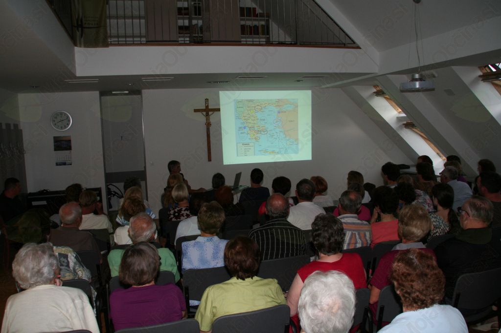 Na povabilo župnika in duhovnega vodjo romanja po Pavlovih poteh v Grčijo Janeza Bernota smo se udeležili tokratnega srečanja tudi romarji iz Brda, da bi skupaj obujali spomine na prevoženo, prehojeno in prepluto romarsko pot. Drugi vatikanski koncil, ki ga je sklical papež Janez XXIII. je podal smernice za večjo in aktivnejšo vlogo laikov pri bogoslužju in pri upravljanju cerkvenih zadev. Tako je tokrat mesto poročevalca prevzel Ciril Grošeljnamesto domačega župnika. In smo se sprehodili po poti, še prej pa osvežili zemeljske in druge značilnosti Grčije. Malce manj časa smo namenili kamnom in kamenčkom, a brez njih ni šlo, tako kakor brez mož in žena brez rok in glav ne. Še pogled v grško kuhinjo in posodje je bil tokrat krajši, kakor v številnih muzejih, vendar smo vseeno radi pogledali tudi to plat zgodovine. Ob številnih posnetkih, ki so nastali na romanju in ob pomoči naše vodičke Alenke iz Aritoursa, so bile razkrite marsikatere zanimivosti, tokrat z drugega zornega kota. Na koncu smo se odločili, da za odlično vodenje presenetimo z praktičnim darilom tudi našo vodičko. Ker pa darila, če ga ne zaslužiš ne znaš prav ceniti, se je morala zanj dodobra potruditi. A to ni bilo čisto na koncu, na koncu je sledilo še druženje ob tokrat ne grški, ampak domači hrani in ne iz popotne torbe, ampak kar iz kuhinje v župnišču. Ob sproščenem pogovoru smo obujali spomine na minulo romanje in se že pripravljali na nova doživetja na prihodnjem romanju skupaj z župnijo Ljubljana Polje in Aritoursom.