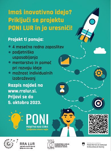 Ljubljana, 25. september 2023 – Regionalna razvojna agencija Ljubljanske urbane regije (RRA LUR) je objavila razpis, v okviru katerega ponovno vabi posameznice in posameznike z inovativnimi in naprednimi podjetniškimi idejami k prijavi v projekt Podjetno nad izzive v Ljubljanski urbani regiji (PONI LUR). Udeleženci bodo tekom usposabljanja osvojili vsa potrebna znanja in veščine za uspešen in učinkovit razvoj svoje ideje ter zagon novega podjetja. V okviru projekta RRA LUR zagotovi podporno podjetniško okolje, v katerem lahko uspešno razvijejo in realizirajo lastne poslovne ideje. Razpis je objavljen na www.rralur.si.