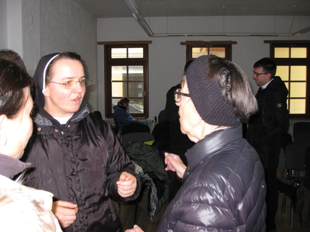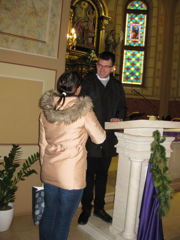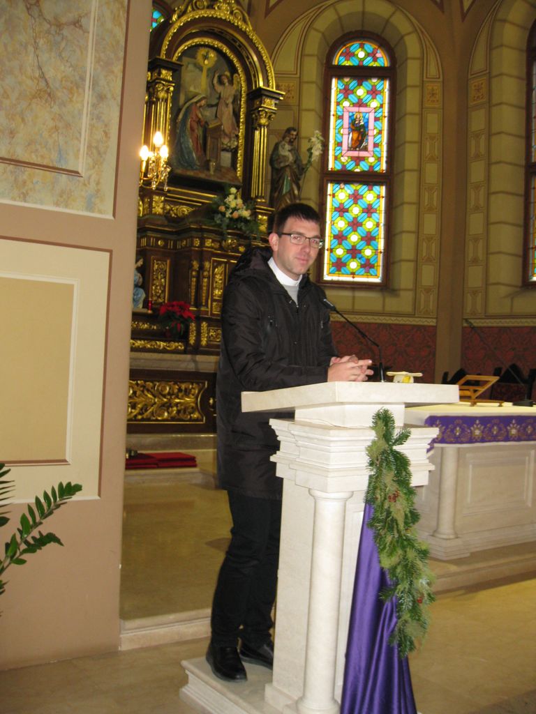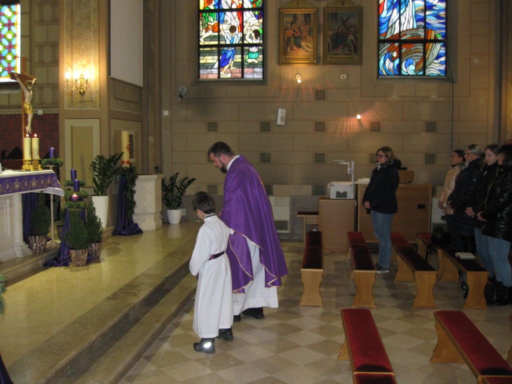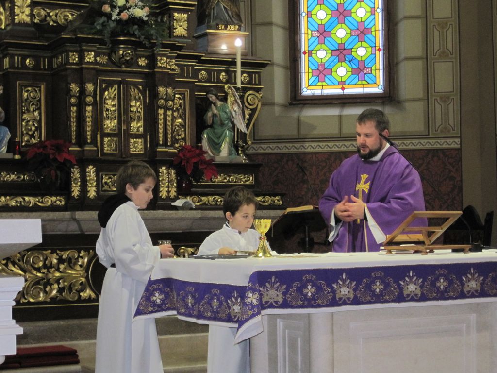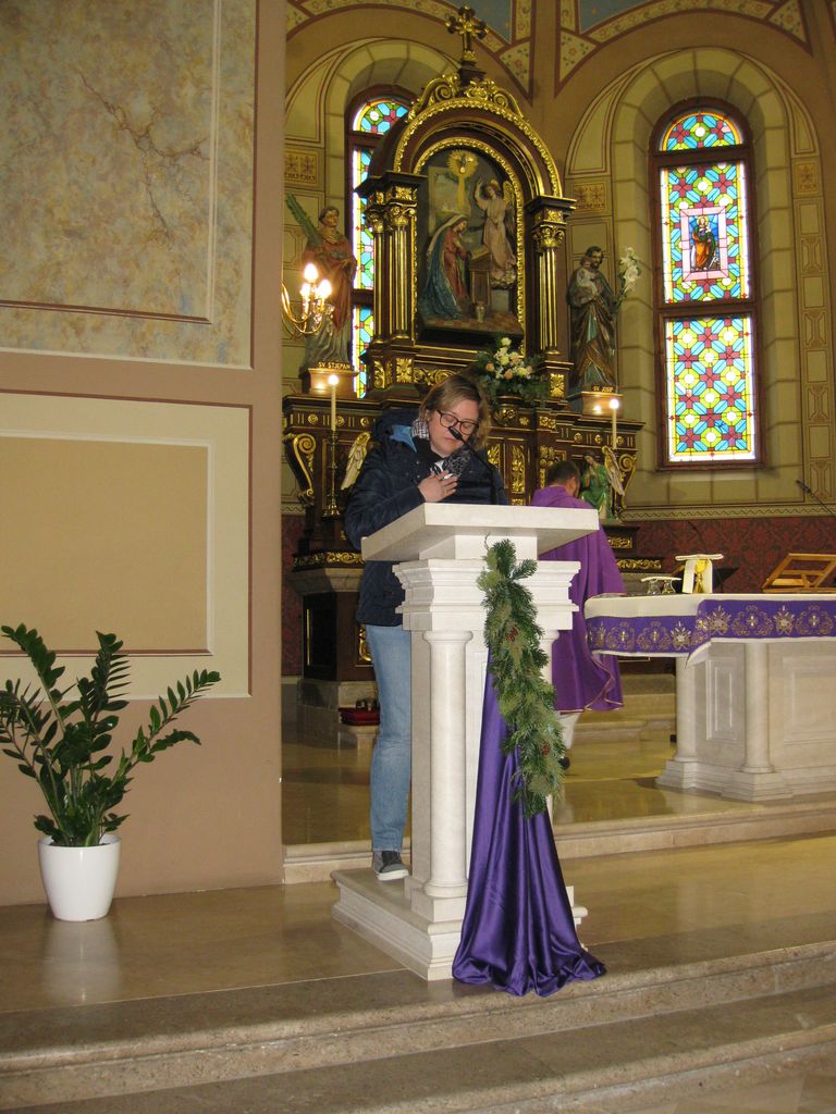 Za srečno pot, za prijeten dan in srečno vrnitev smo se, na poti do našega prvega romarskega cilja, Velike Gorice, med vožnjo z jutranjo molitvijo in rožnim vencem priporočili Bogu in svetemu Krištofu. V cerkvi Marijinega oznanjenja v Veliki Gorici smo imeli sveto mašo, ki jo je daroval Bernard Rožman. Pred začetkom svete maše nam je o cerkvi in o utripu v župniji spregovoril diakon Filip Franjić, ki je, čeprav je prišel na župnijo šele pred kratkim, lepo opisal tako zgodovino cerkve kot utrip v župniji . Cerkev je ena izmed najstarejših v Turopolju in iz nje sta nastali še dve župniji in sicer blaženega Alojzija Stepinca in svetega Petra in Pavla. Čeravno nima statusa katedrale, jo imenujejo turopoljska katedrala, predvsem zaradi njene starosti. Nastala je na temeljih male cerkvice z lesenim zvonikom in poleg številnih razširitev preživela kar dva velika potresa in sicer leta 1880 in 2020. Po prvem potresu je pri obnovi sodeloval arhitekt Herman Bollea, danes pa obnovo vodi kar nekaj firm. V zadnjem potresu je največjo škodo utrpel zvonik in želja je, da se za letošnji božič iz zvonika ponovno oglasijo zvonovi. Utrip v župniji je zelo živahen saj imajo poleg biblične skupine tud od 30 do 40 ministrantov, kateheze za mladino in študente, otroški zbor, mešani zbor in zbor mladih, ter moško vokalno skupino sveti Josip. Kateheze pripravljajo tudi za zaposlene mlade, poleg tega pa še oratorij za otroke različnih starosti. Tudi birmanci imajo svoje večere, ki jih radi obiskujejo. Po končani sveti maši smo bili povabljeni še v njihov pastoralni dom, ki je poleg župnišča in v katerem so se ravno pripravljali na miklavževanje, nas pa so prijazno pogostili s pijačo, toplim čajem in piškoti.
