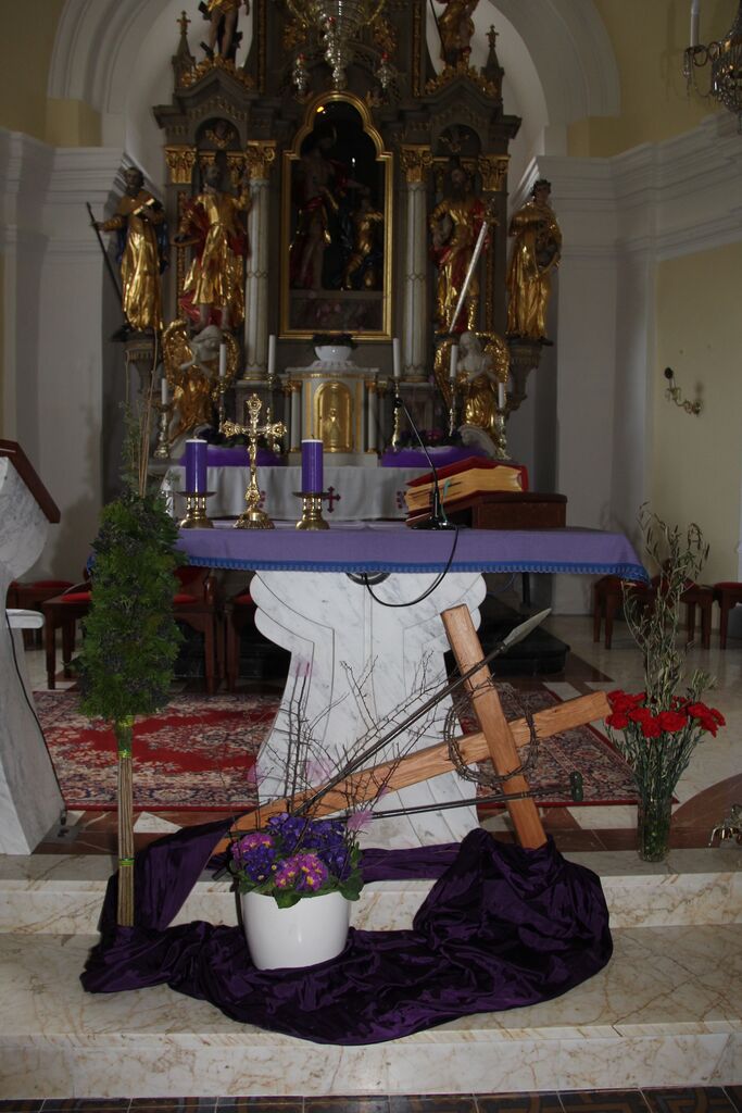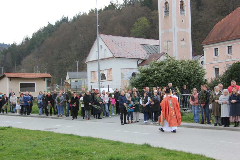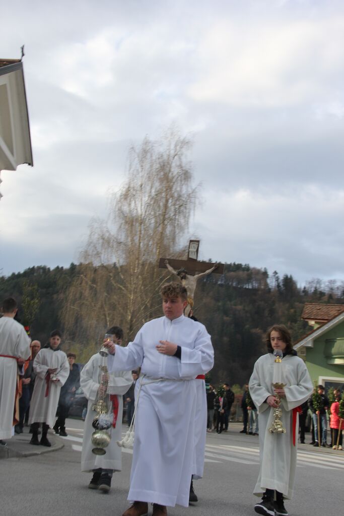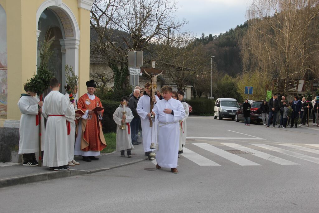 Po obredu so v sprevodu krenili v cerkev, kjer se je nadaljevalo bogoslužje. Gregor Luštrek je blagoslovil še butarico, ki je krasila oltar, nato pa se je sveta maša nadaljevala z branjem beril in pasijona.