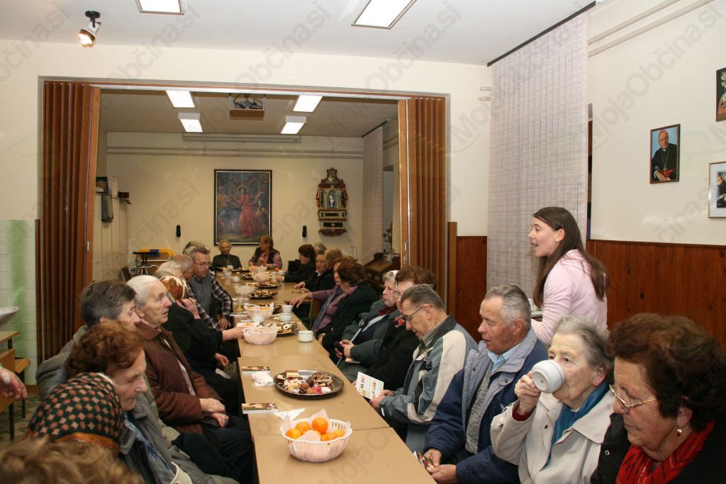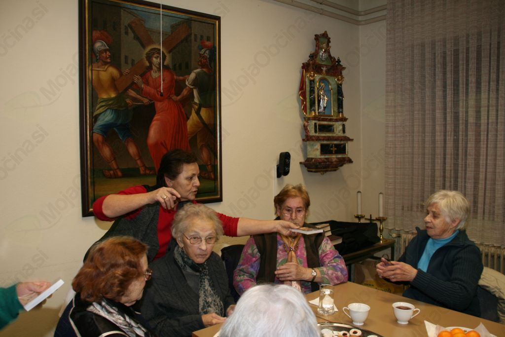 Srečanje se je začelo z duhovno pripravo na praznike, nadaljevalo s sveto mašo in končalo s prijetnim druženjem v medsebojnem pogovoru. Tokrat je zbrane nagovoril duhovni pomočnik Ivan Povšnar, ki je zbranim spregovoril o dogodkih na Monte Marii pri evharističnem slavju za bolnike. Svoje besede je še podkrepil z nazornim prikazom in tako svoj nagovor naredil lažje razumljiv vsem zbranim. Spregovoril je še o dobrih delih, ki jih lahko delamo ne glede na našo starost, in nam na koncu svete maše zaželel še blagoslovljene praznike in njegovim čestitkam sta se pridružila še domači župnik in predstavnik Karitas. Prijetnega druženja in pogovora o tem in onem tudi po manjši obdaritvi še ni bilo konca, kajti srečanje krepi tako skupnost, ki srečanje pripravi, kakor daje notranjega poguma vsem starejšim, ki nanj pridejo.
