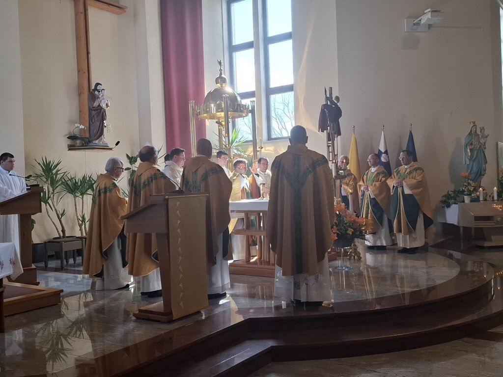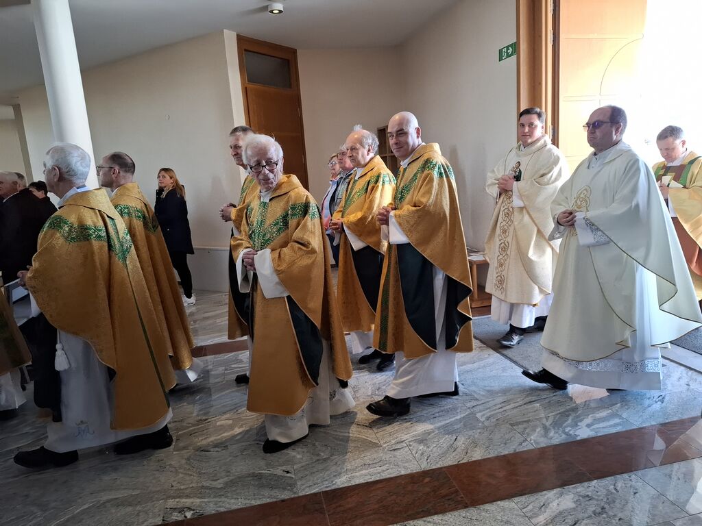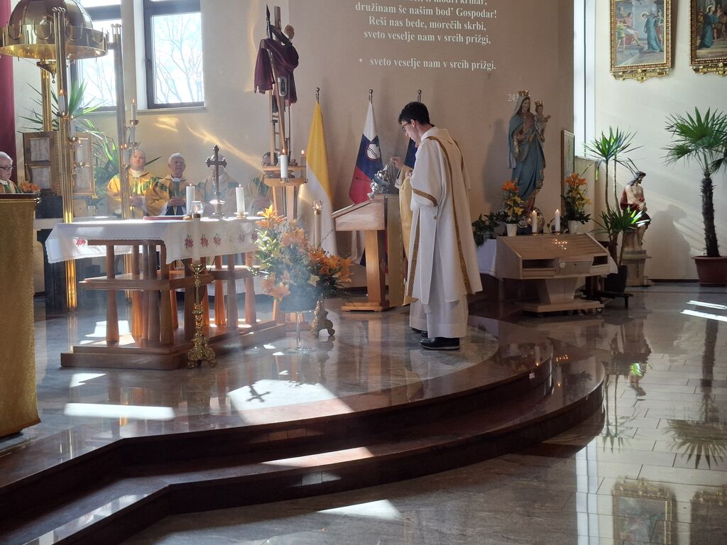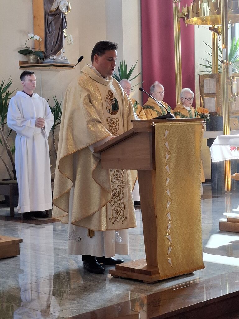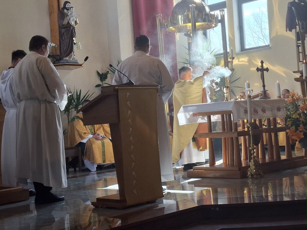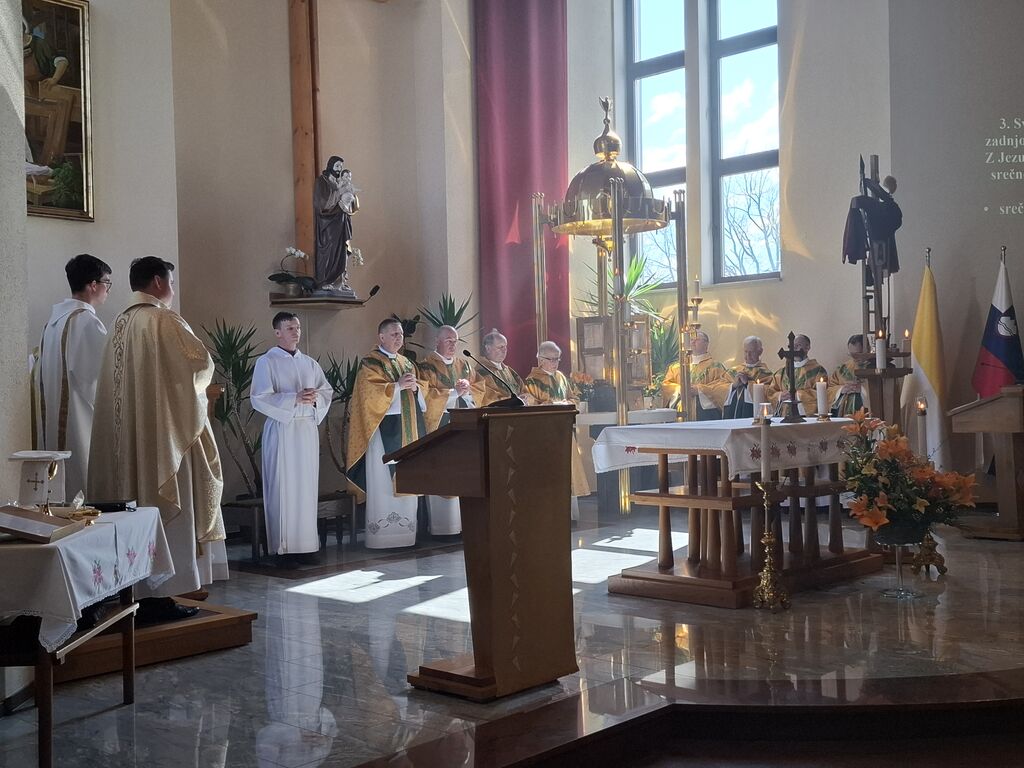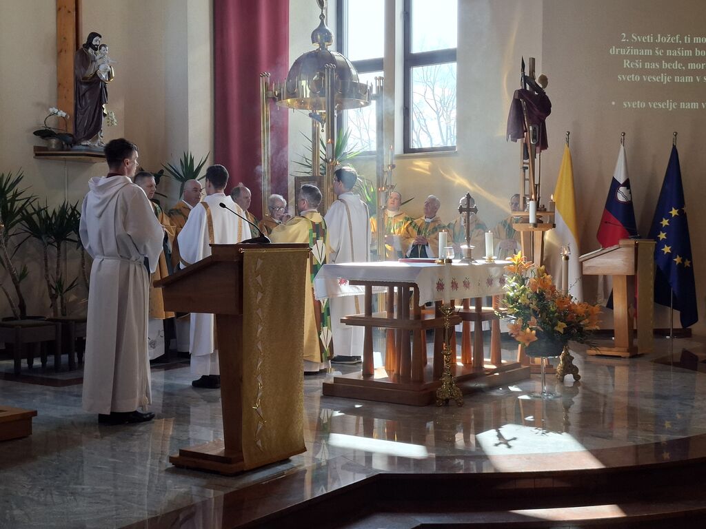 Tokratni 19. marec, ko se slavi god zavetnika svetega Jožefa in obenem župnije Vir, je bil na četrtek, zato je slovesna sveta maša na čast zavetniku slovenskih dežel za blagoslov domovine, za srečno zadnjo uro ter za može in fante bila prav na ta dan. Župnija svetega Jožefa na Viru je najmlajša župnija v dekaniji Domžale in tokrat so k sveti maši, ki se je pričela ob 10. uri, prišli verniki iz vseh koncev dekanije, da počastijo zavetnika virske cerkve sv. Jožefa. Romarje in tudi duhovnike iz cele domžalske dekanije je najprej nagovoril domači župnik Vito Urbanija in ker je sedanja župnija kar nekaj let sodila pod župnijo Dob je sveto mašo daroval župnik Jure Ferlež iz župnije Dob. Svete maše v čast svetega Jožefa na Viru so se poleg domačega župnika in mašnega pridigarja udeležili še duhovnika Bernard Rožman in Gregor Luštrek iz Brda in Krašnje, dr. Boštjan Guček iz Trzina, Marko Košir in Marko Pajk iz Mengša, Miro Šlibar častni kaplan bazilike v Lurdu in član kapitlja lurških kaplanov, mag. Klemen Svetelj in duhovni pomočnik Andrej Svete iz župnije Domžale in Andrej Marko Poznič iz župnije Ihan. Poleg njih sta bila pri oltarju še letošnja novomašnika, sedaj še diakona Gregor Capuder iz Moravč in Luka Anžič iz Ihana. V svojem nagovoru je tokrat Jure Ferlež dejal: Dragi bratje in sestre, ena globoka skrivnost je v tem, zakaj sveti postni čas prekinjamo z dvema pomembnima praznikoma. Cerkev želi, da ko počasi, vedno globlje vstopamo v identiteto Jezusa Kristusa in se po njemu podamo, da v skrivnost Jezusa vstopimo skozi dva, ki sta mu najbližja. In to sta Devica Marija in sveti Jožef. Pa bi se morda lahko vprašali, zakaj potrebujemo ta dva? Ali nismo morda bližje, če se kar direktno odpravimo k Jezusu? Podobno je, kot če opazujemo nočno nebo. Na nek način sta tista dva, ki gledata oziroma eden gleda s prostimi očmi, eden pa z daljnogledom. Enako daleč, ampak daljnogled nočno nebo približa. In ko Marija stoji ob obisku Elizabete: "Moja duša poveličuje" v latinščini "magnificat" pomeni dela večje, dela bližje. In tako se skozi Marijo in Jožefa slika ne popači, ampak izostri. In skozi njiju vstopamo v skrivnost Jezusa Kristusa, njegove smrti in vstajenja, da bi naša slika ostala dovolj ostra in da bi znali priti blizu. Druga misel v današnjem prazniku. Rad bi vam prebral dva odlomka, ki me zelo nagovarjata, pa nista iz današnjega evangelija. Ko pravi v Janezovem evangeliju Jezus, da je kruh iz nebes, kruh življenja, ki prihaja iz nebes, je odgovor takšen: Ali ni to Jezus, Jožefov sin? Njegovega očeta in mater poznamo. Kako more zdaj govoriti: "Iz nebes sem prišel"? In ko pride v Matejevem evangeliju v Nazaret, njegovi rojaki takole odgovorijo: "Od kod temu ta modrost in ta mogočna dela? Ali ni to tesarjev sin? Ali ni njegovi materi ime Marija, njegovim bratom pa Jakob, Jožef, Simon in Juda?" In tako naprej. Čeprav imamo mi vsi Jezusa za izjemno osebnost, pa v očeh njegovih rojakov Marija in Jožef nista bila nič izjemna. Celo drugače, preveč preprosta, da bi razumeli njuno in Jezusovo skrivnost in posebnost. In to nas danes uči: Kdor ostane slep za preprostost, ostane slep za Boga. In imenitnost Jezusa Kristusa doživljamo tudi tako tudi takrat, ko doživljamo imenitnost njegove deviške matere in njegovega deviškega varuha, da vstopamo skozi Marijo in Jožefa k Jezusu. Zato vera, ki jo danes tukaj izkazujemo, pomeni narediti korak dlje od površnosti, ki so si jo privoščili rojaki v Nazaretu. Pomeni stopiti v notranjost in v navadnem, preprostem videti Božje sile, Božje stopinje. Tretjič, večkrat slišimo, da Jožef v Svetem pismu ne spregovori, da je tiho. V zgodovini teologije se je pojavila misel, da Bog Oče krušnemu sinu vzame krušnemu očetu svojega sina, vzame besedo, vzame možnost govorjenja. Pa je to Cerkev razglasila za napačno. Jezus se umakne, Jožef se umakne, da Jezus raste podobno kot pri Janezu Krstniku. On utihne, da da prostor besedi. Svoje besede umakne, da spregovori, ta Božja beseda. In konec koncev, to je tudi naša postna vaja: umakniti se Kristusu tako, omehčati svoj ego na način, da bi skozi naša usta, skozi naš zgled spregovorila Božja beseda, Jezus Kristus sam. In da bi lahko v našem govorjenju, v našem zgledu prepoznali tistega, ki mu služimo in ki je naš sodnik, odrešenik in stvarnik. Utihne, da da prostor Jezusu. In zadnja misel današnjega praznovanja. Trinajstletni deček ostane po prazniku v Jeruzalemu. In Marija in Jožef ga tri dni iščeta. Umakne se jim. Umakne se od očetovega hiše. In ko se po treh dneh znova najdeta, Marija in gotovo tudi Jožef, besede, ki jih Jezus govori, ohranita v svojem srcu. Naslednjič, ko se Jezus za tri dni umakne, je v času velikonočnega trodnevja. Umakne se, gre v tako imenovan šeol iskat starozavezne pravične in jih potem z vso silo, z vso močjo Boga, ki vstaja od mrtvih, privede v večnost. Ampak Matejev evangelij gre še celo morda en korak naprej. Matej pravi, da ko Jezus umre, da začnejo grobovi, da se začnejo grobovi odpirati in da začnejo vstajati pravični Stare zaveze in se celo začnejo prikazovati v Jeruzalemu. In to nam daje, pa ne samo nam, celotni Cerkvi eno zadoščenje tudi v odnosu do svetega Jožefa. Čeprav Jezus pravi, da je Janez Krstnik največji v Stari zavezi, smo lahko prepričani, da je v tistem šeolu največja zvezda gotovo svet. In da ko Jezus pelje pravične v svojem vstajenju v odrešenje, da se tam med tistimi, ki se takole v Jeruzalemu prikazujejo, tudi sveti Jožef. In lahko smo prepričani, da Jezus potem v svojem odrešenju znova združi tako prvo pričo vstajenja, ki je Devica Marija, kot tudi pravičnega iz Stare zaveze, ki je sveti Jožef. In ki je v nekem šeolu čakal to odrešenje. In kjer je sveta družina, tam so bratje in sestre. Tam ni prostor za smrt, tam je prostor za življenje. In potem svete družine se upodabljajo tudi v današnjih družinah, da 