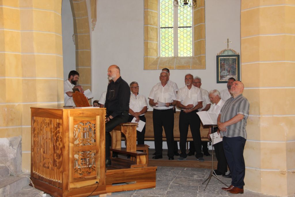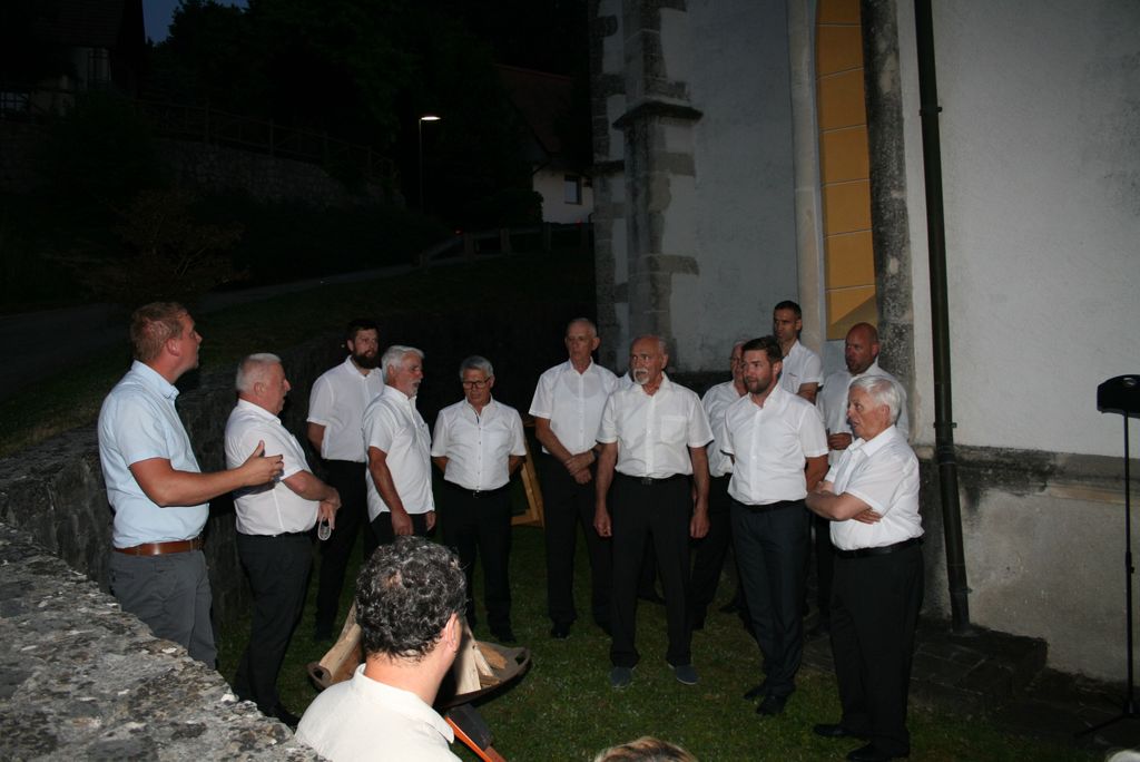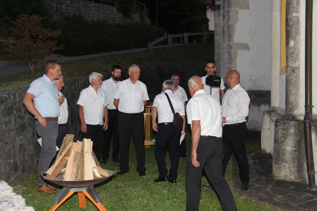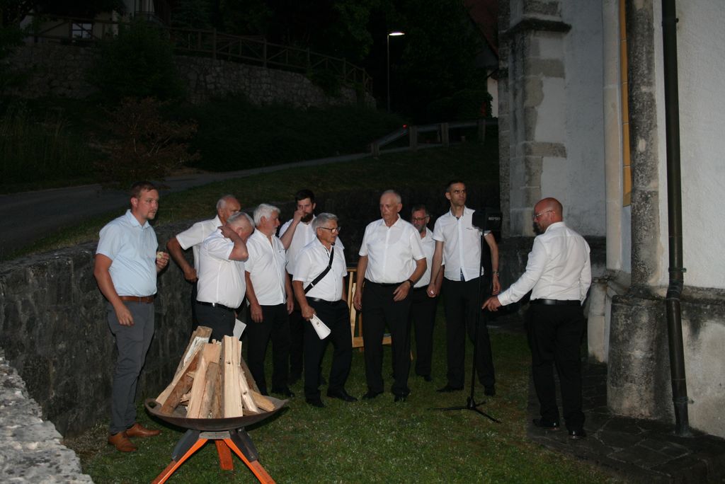 Po končani sveti maši smo pred cerkvijo prisluhnili še nekaterim pesmim, ki so nam jih zapeli pevci in če so za uvod v sveto mašo zapeli Zdravico so tokrat na vrsto prišle druge domoljubne pesmi, kot je tudi Oj Triglav moj dom.