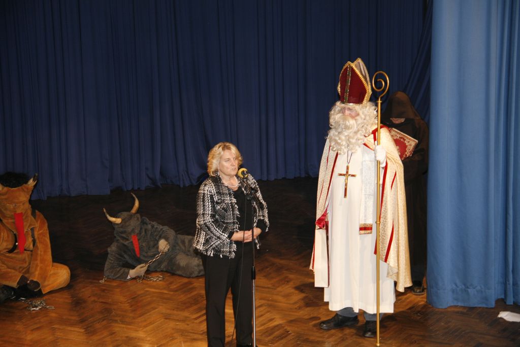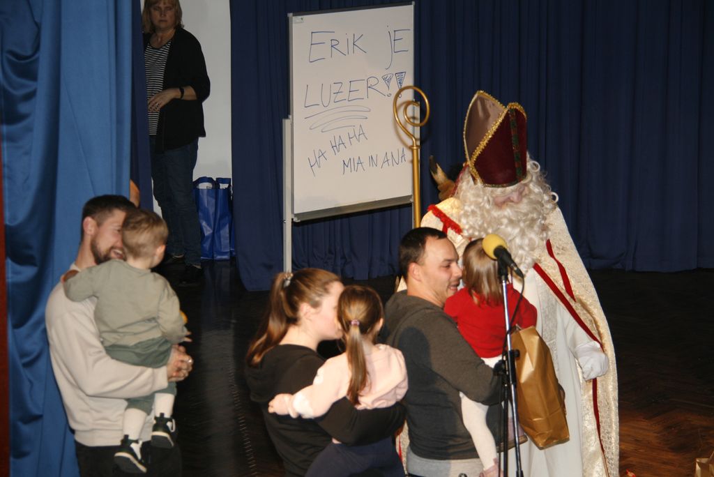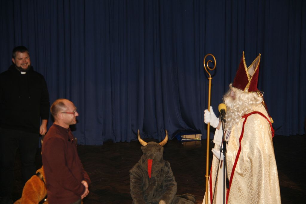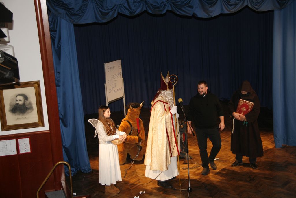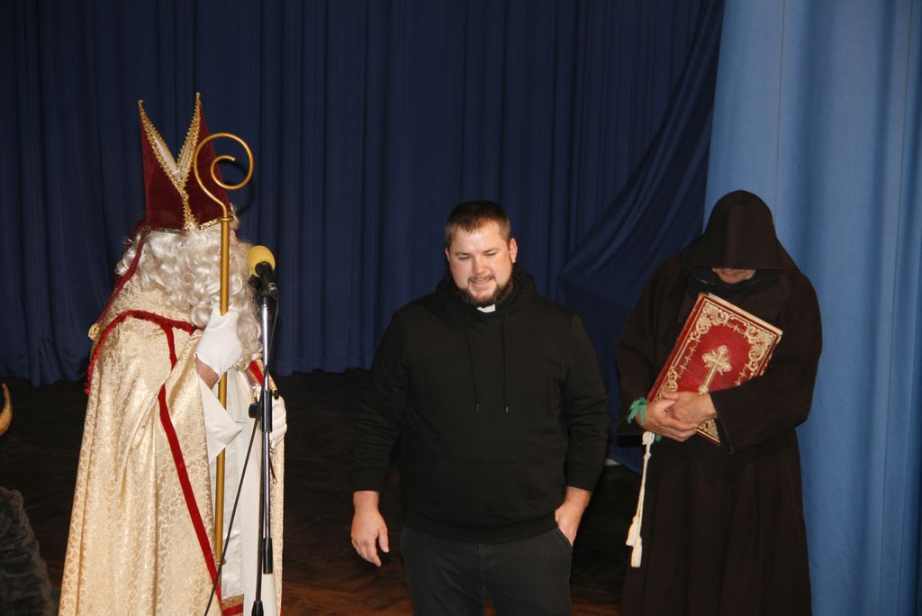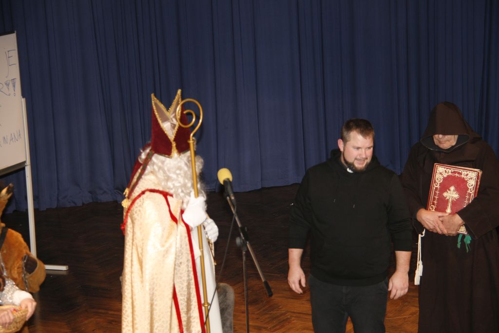 Igralci so ob pomoči vseh v dvorani priklicali tudi svetega Miklavža, a so zaradi njegovega spremstva, ki ni ravno na najboljšem glasu, hitro pobegnili z odra. Sveti Miklavž je najprej zbrane povprašal po molitvi in kaj hitro ugotovil, da mladi zanjo še kako dobro moliti. Zato je najprej obdaril veroučence prvega in drugega razreda in potem razdelil darila še vsem ostalim. Brez darila nista ostala niti župnik Bernard in duhovni pomočnik Gregor, ker sta si ga, kot je dejal Miklavž s svojim delom zelo zaslužila.