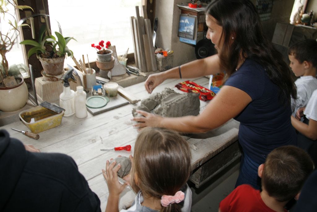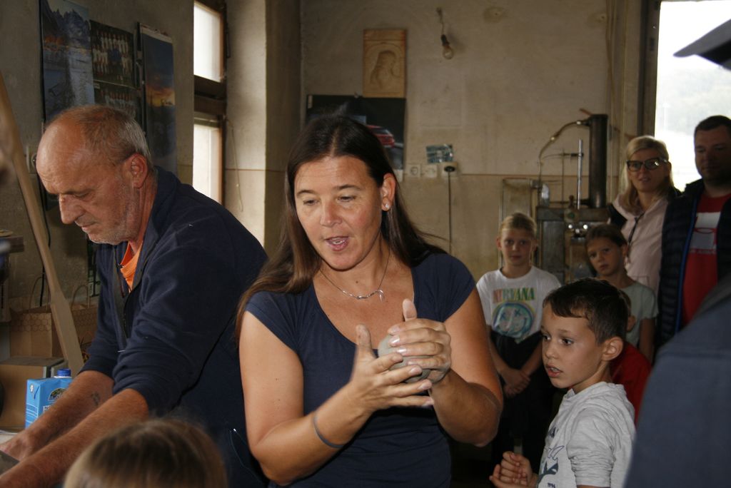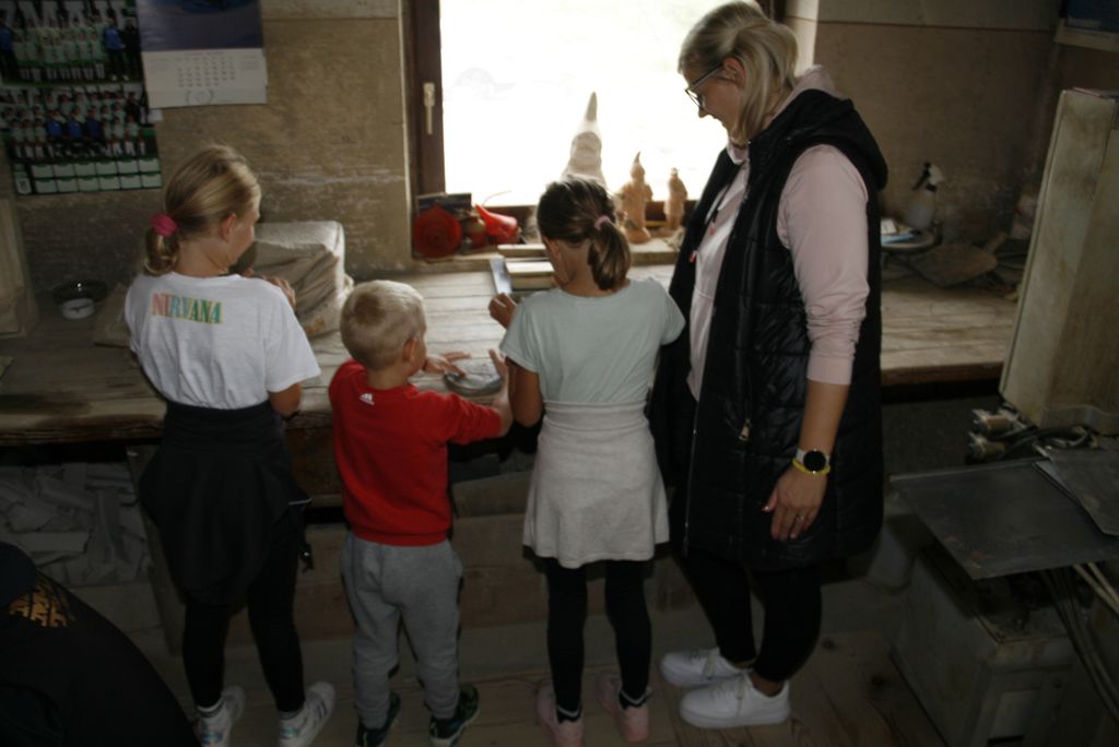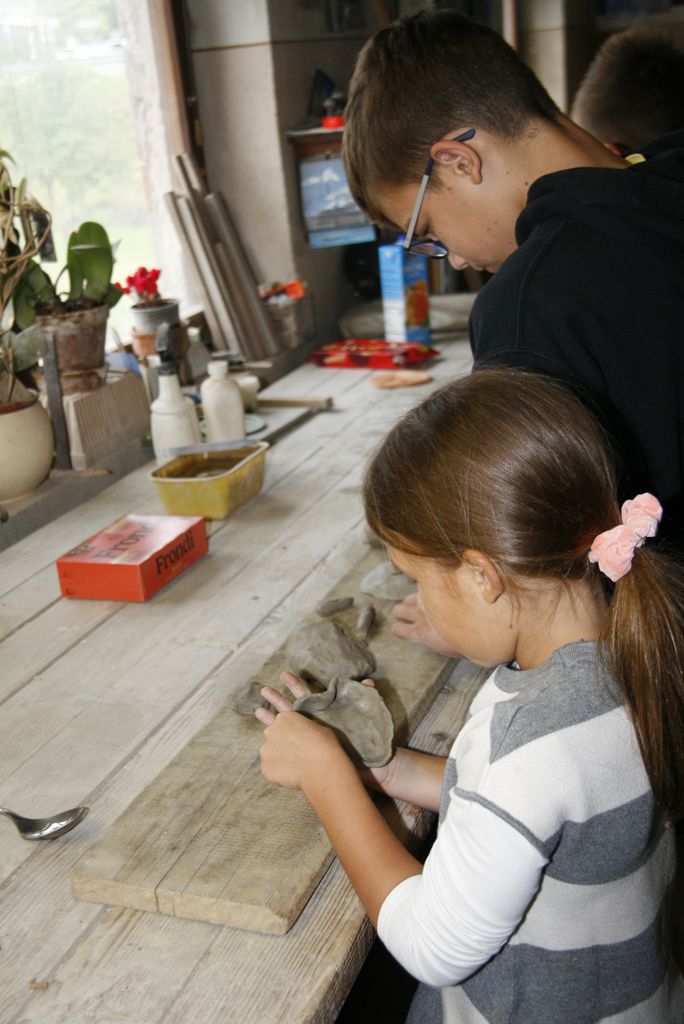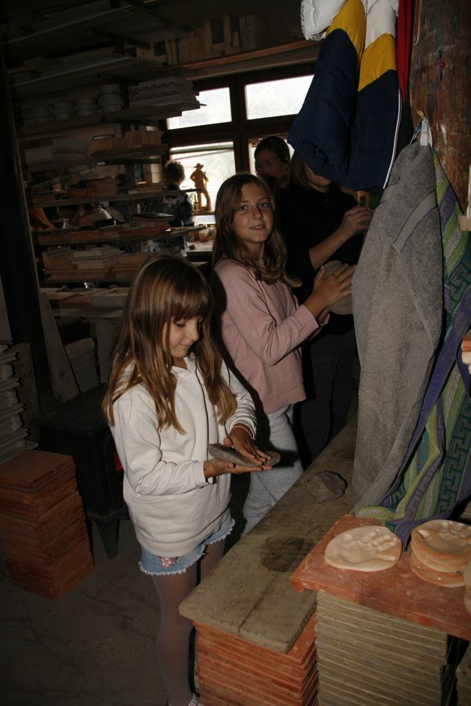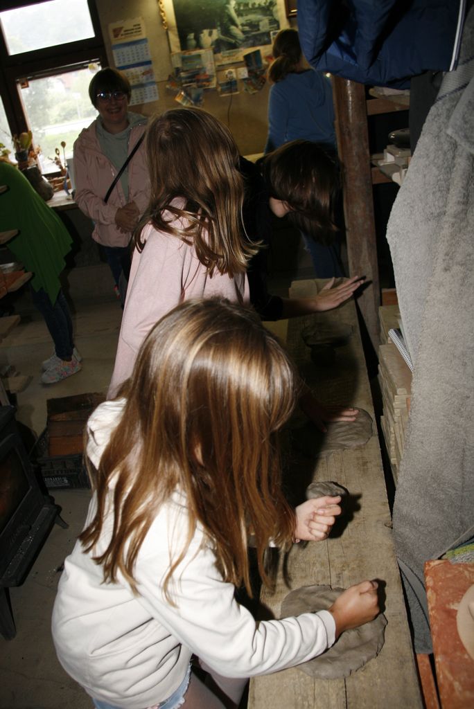 In se je začelo najprej nekaj tehničnih podatkov in še pogled kakšen bo na koncu končni izdelek izpod njihovih rok nato je vsak otrok dobil kepo gline in mesto na delovnem pultu. Glino, ki se da lepo oblikovati in pomaga tudi pri različnih boleznih saj ima izredno vpojno moč, je dobil vsak toliko kolikor veliko je imel dlan. Preden so dobili glino so zavihali rokave in nato so že gnetli, tolkli, oblikovali, pritiskali in ne vem še kaj, da so na koncu lahko vtisnili svojo dlan v narejeno podlogo. Med tem so si starši, le tisti, ki so imeli še majhne otroke ne, ogledali koliko truda in ročnega dela je potrebno, da nastane ena pečnica, ali tlakovec.