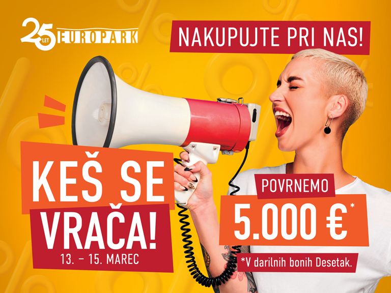Od četrtka, 13. marca pa do sobote, 15. marca, se nakupovanje pri nas še posebej izplača. Našim kupcem bomo namreč za nakupe povrnili kar 5.000 €. Sodelujete lahko vsi, ki boste v kateri koli trgovini ali gostinskem lokalu v Europarku opravili nakup v vrednosti vsaj 10 €.