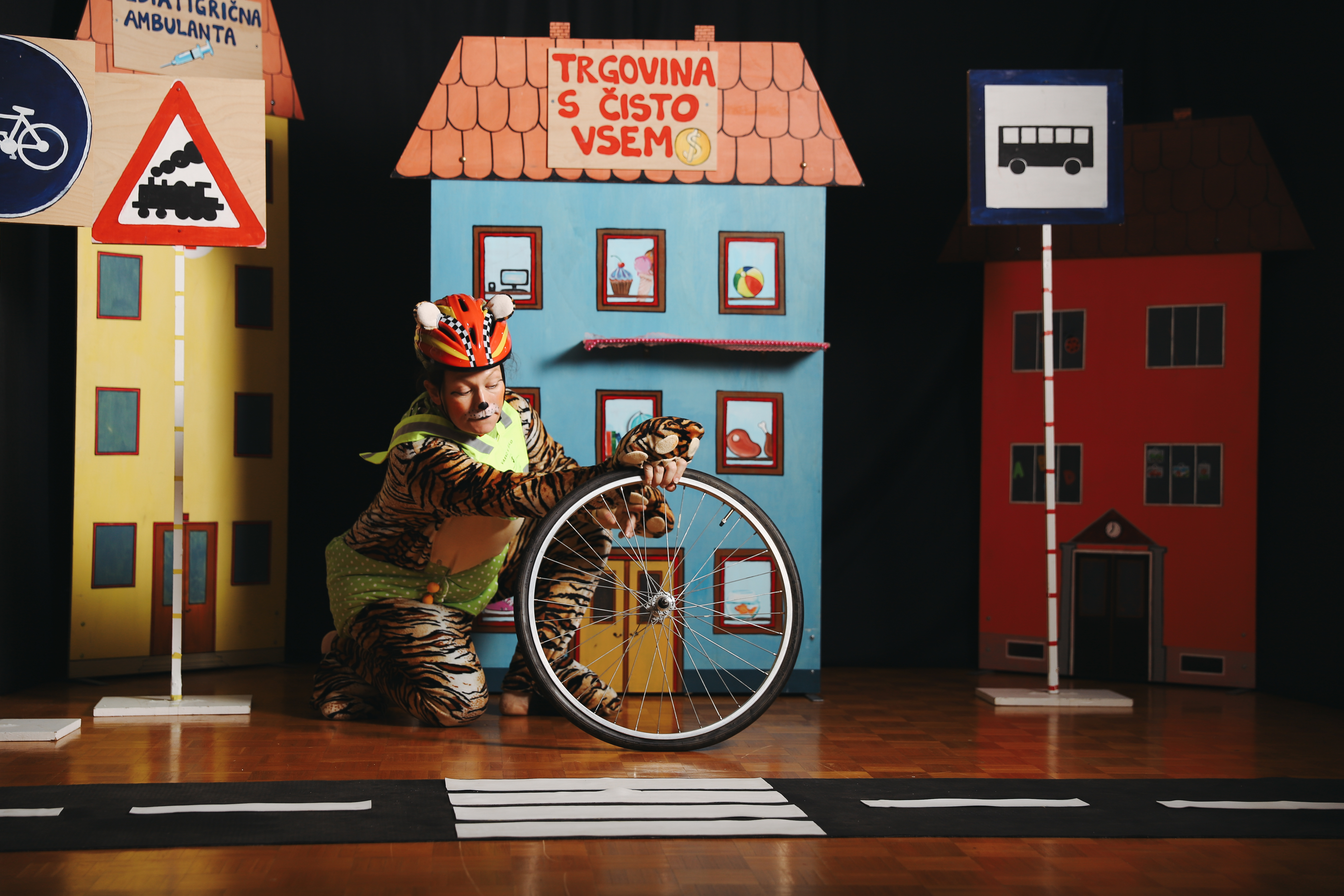 Iskriva zgodba o mladičku tigru, ki ga otroška zvedavost popelje iz živalskega vrta v mesto, ozavešča o aktualnih vrednotah trajnostne mobilnosti, ki jih preplete z varnostjo v cestnem prometu. Najmlajši se skozi pesmice in smeh, poučijo o nevarnostih, ki prežijo na majhne udeležence v prometu in ob tem, ko mladičku pomagajo varno vrniti se domov, spoznajo kako zabavne so alternativne oblike prevoza - vlak, avtobus in kolo. Sredi napetih dogodivščin, te interaktivne predstave, v kateri so poleg malega tigra osrednji junaki prav otroci, močno krepijo vrednote sodelovanja, solidarnosti in empatije.