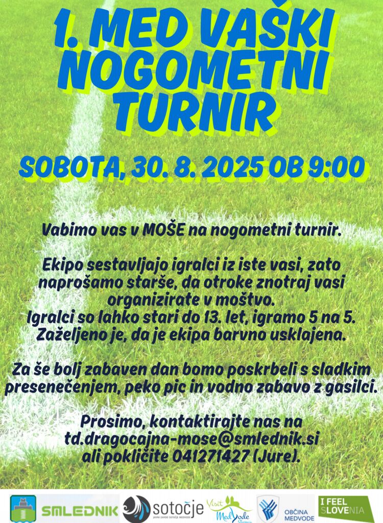 Vabljeni v Moše na nogometni turnir za osnovnošolce. Tekmuje se med vasmi, zato pozivamo starše, da znotraj vasi otroke organizirate v ekipo.