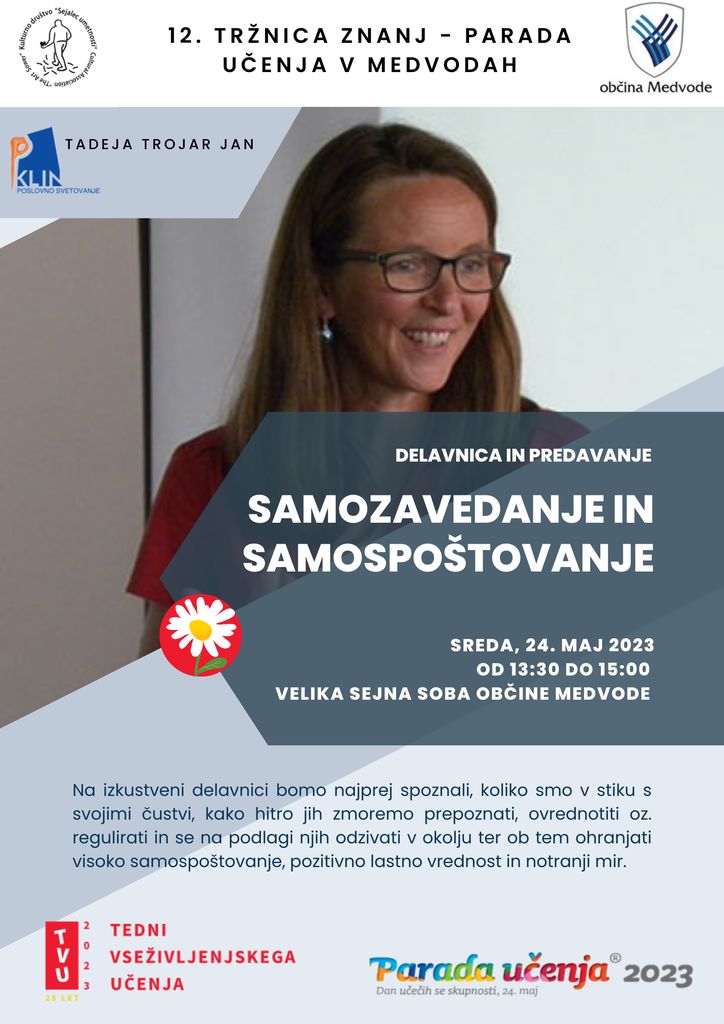 Od 13:30 – 15:00 ure – delavnica in predavanje: SAMOZAVEDANJE in SAMOSPOŠTOVANJE, KLIN, poslovno svetovanje, mag. Tadeja Trojar Jan, univ. dipl. psihologinja, velika sejna soba Občine Medvode