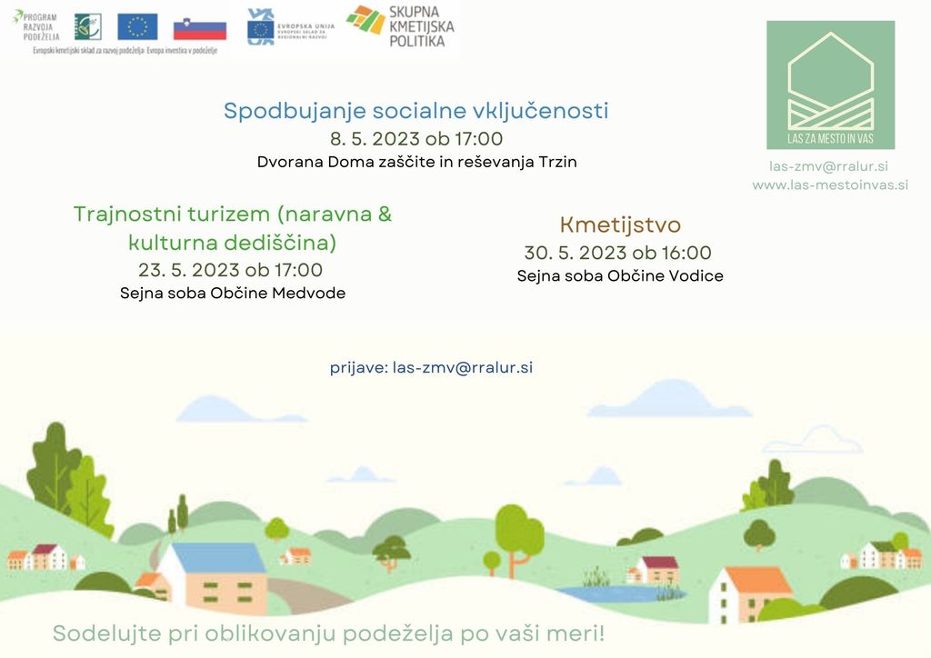 - Kmetijstvo (priložnosti za razvoj dopolnilnih dejavnosti, inovativnih produktov, novih verig, …), 30. 5. 2023 ob 16:00, Sejna soba Občine Vodice (Kopitarjev trg 1, Vodice)